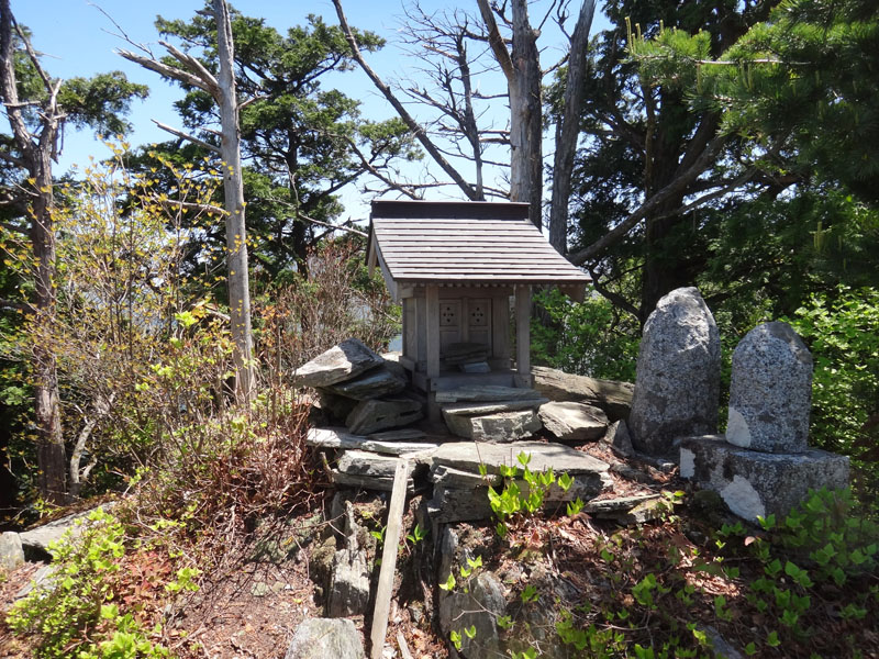 そこから先はけっこうキツイ登り坂に変わる。 下兜山直前には大きな岩と、左に巻いて登るためのロープがかかっていた。 これを越えると三角点があり、下兜山直前の急な登りへ。 そして、下兜山山頂に到着。