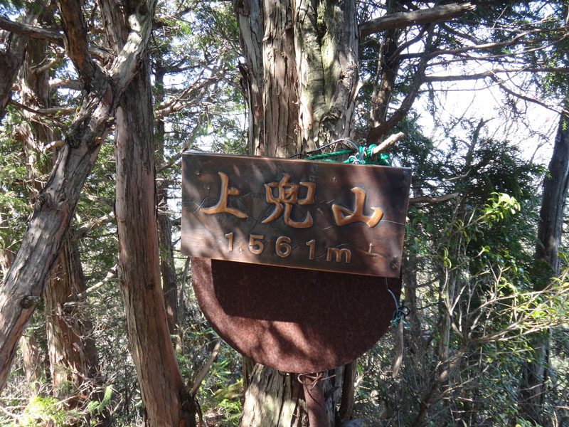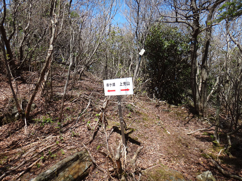 ここからも薄いマーキングを頼りに歩いて行く。 急傾斜が何度かあり、少し歩くと、「串ヶ峰← →上兜山」の看板が出現。 上兜山は目前。 さぁあと少しがんばろう。 ここから数分、胸くらいの笹漕ぎがあって、最後の急傾斜を登ったら、上兜山に到着した。 ここまで5時間、かなりクタクタだ……
