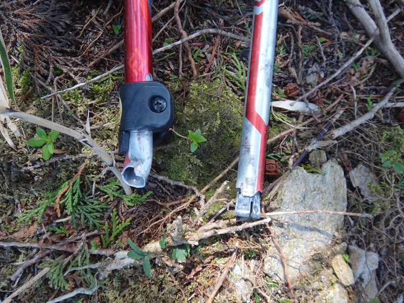 あまりゆっくりしている時間も無いので、ラーメンを食べて少し休憩をしたら帰ることに。 まずは下兜山まで。 今歩いてきた道を戻る。 しかし途中でアクシデントが発生。 序盤からずっとストックを使っていたのだけど、ここの下りで足を滑らせて転倒。 ザックが衝撃を吸収してくれたし、足元は笹だったので問題は無かったのだけど、ちょうど切り株みたいなやつがあり、ストックに変な負荷がかかってしまったらしい。 ボキッといい、ストックは折れてしまった…… まだ下りが始まって10分くらい、これから数時間の下りでストックが大いに役立ってくれるはずだったのに…… 折れてしまったものは仕方ない、片方のストックだけで、足の負荷を軽減しながら下りていくことに。