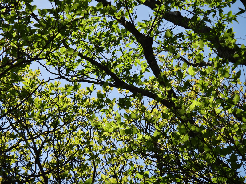 樹林帯の中にいるから気づかないけど、木々の上を見ると霧雨みたいなのが降っている。 上は雲の中だろうし、雨か……