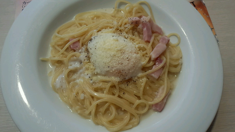 お昼はグラッチェへ。 カルボナーラとアッサムティでくつろぎながら、ゲームを楽しむ。