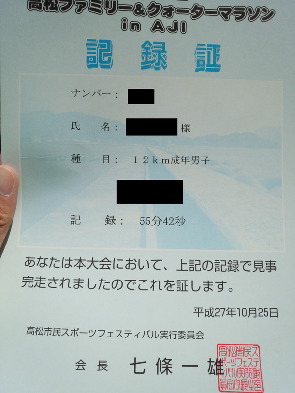 それでもタイムは55分42秒。 去年のタイムを3分7秒更新。 57分切れたらいいかなぁ、と考えていたので、結果的には満足できるタイムを残すことができた。