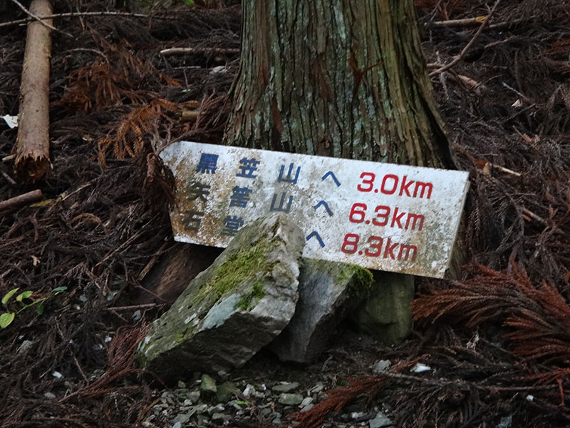 歩き続けて、黒笠山山頂まで2.0kmの看板まで到着。 いつもここで休憩するので、今日もここで休憩する。 今日は天気も悪いし、ここでやめておこうかな……