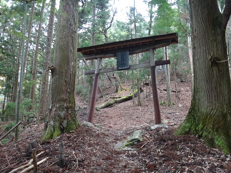 登山口から入り、民家の脇を通って登山道へ。 出だしから急な道をひたすらと登っていく。 15分くらいで廃屋があるのだが、そのあたりで雨が強くなってきたため、レインコートの上を着る。 暑くなるが、そのまま歩いて鳥居を通過。