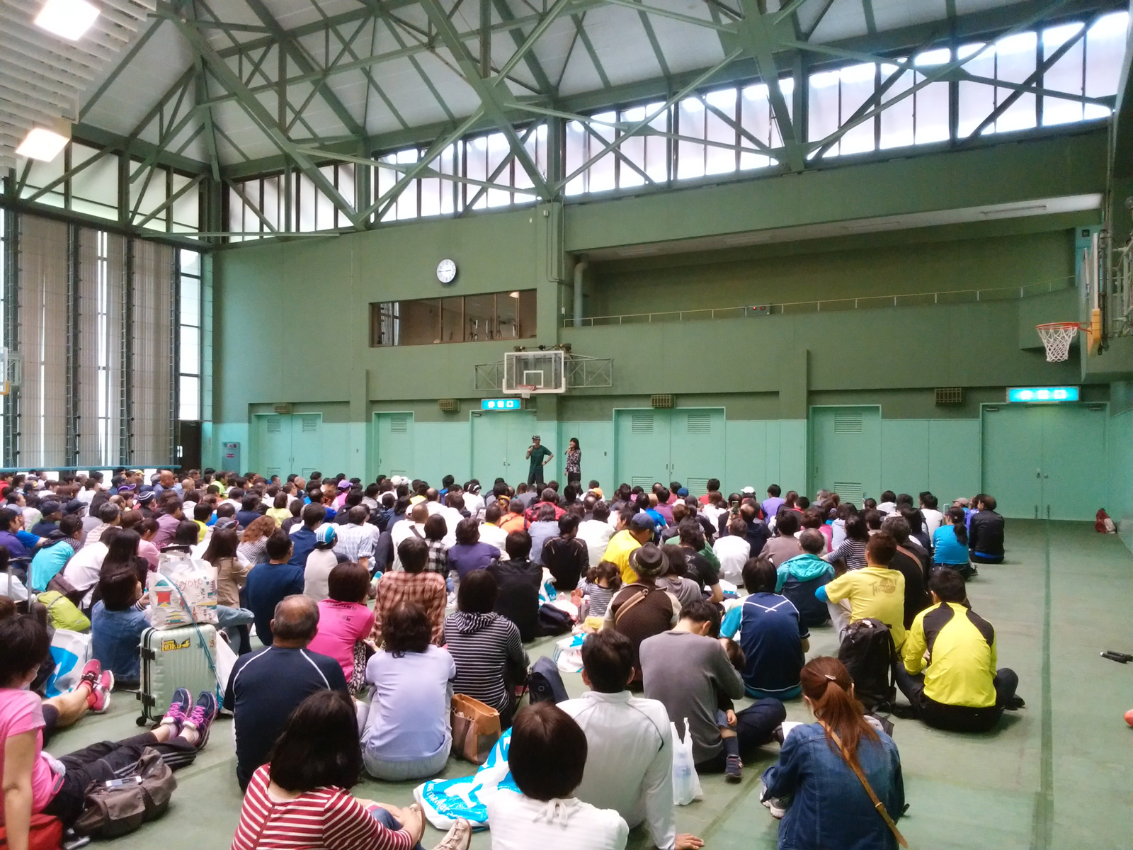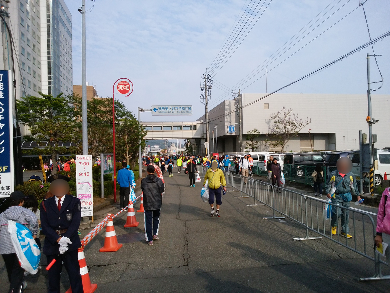 徳島IC下りて、10分くらい走った大阪湾沿いに、小松海岸緑地というところに1,400台の駐車場が用意してあるみたいなので、そこに車を止める。 小松海岸緑地からスタート地点まではシャトルバスがあるので、それを利用する。 車の中で着替えて、荷物を持ってシャトルバスに乗り込む。 シャトルバスは20台くらいずらっと止まっていた。 バスに乗って、ものすごい眠かったので寝てしまった。 気づいたら議員会館という、当日受付&スタート地点付近に到着していた。