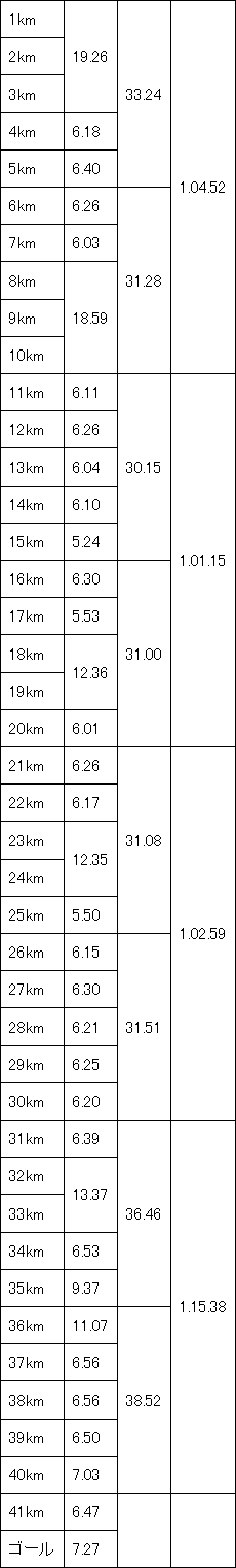 混雑も無くなってきて自分のペースで走れるようになってきた。 が、今回の目標は4時間切りだけど、それと「歩かない」というのも目標にしている。 今までフルマラソンは4度出場しているけどいずれも10km近くは歩いてしまっている。 ゆっくりでも歩かず走り通せればそれはタイムに反映されるはず。 そうすれば自然とサブ4も見えてくる。