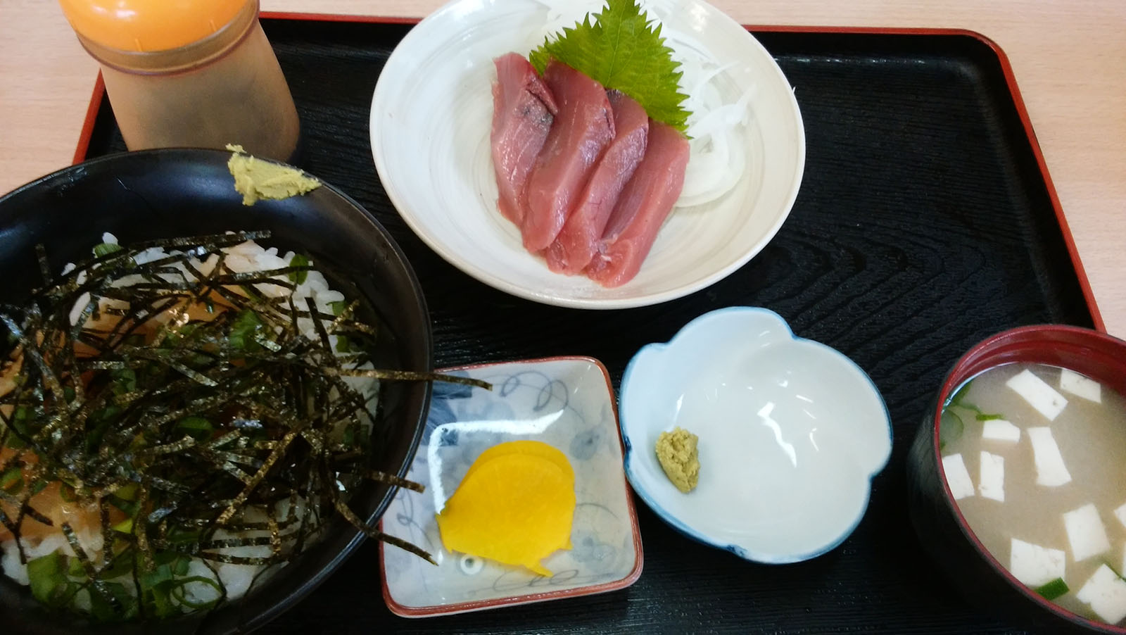 昨日、漁師の人に教えてもらったお店に向かう。 福浦漁港というところにある「市場食堂」とうい所へ。 海産物を食べたいので「ふかうら真鯛のごまだれ丼とかつおの刺身セット」を注文。 ごまだれ丼もかつおの刺身も美味しかった。