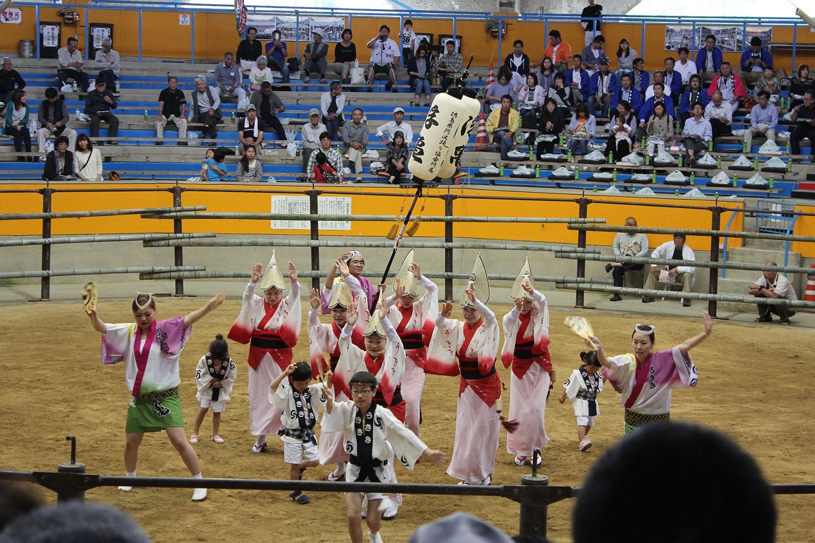 闘牛場へは11時位に到着。 11時半からは阿南から来たという阿波踊りの「浮亀連」というグループの阿波踊りを見る。 阿波踊り見るの初めてだけど、かなり激しい動きだった。 踊っている人は踊り終わったら息が弾んでいたし。