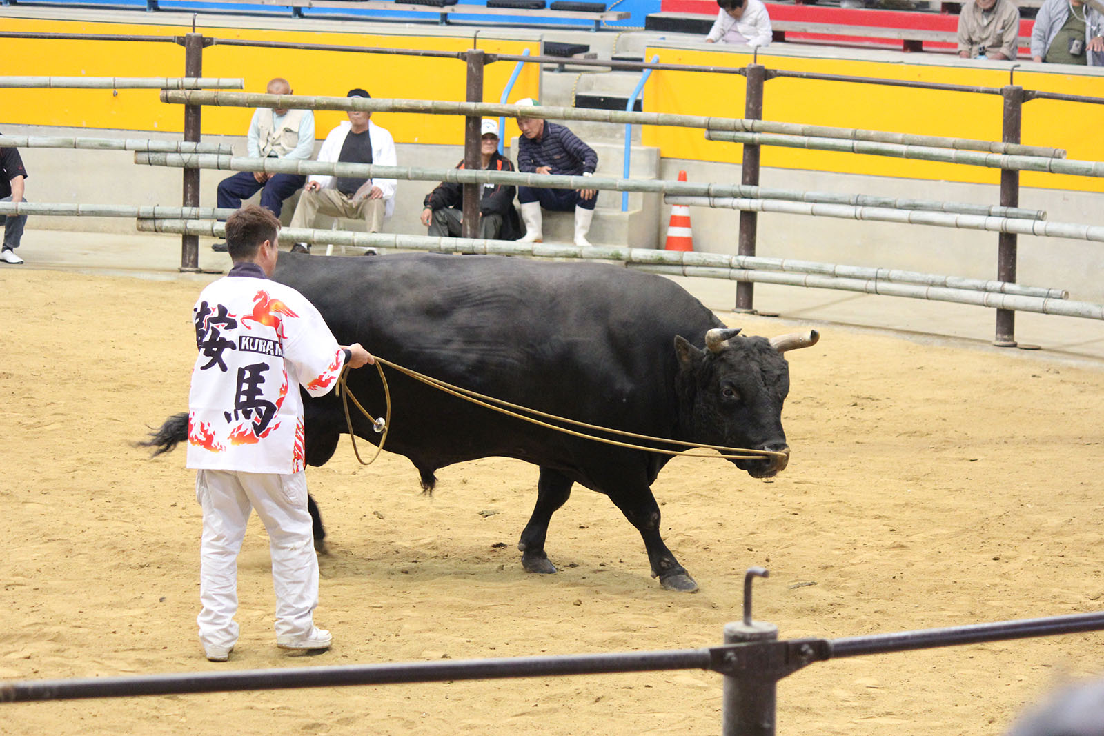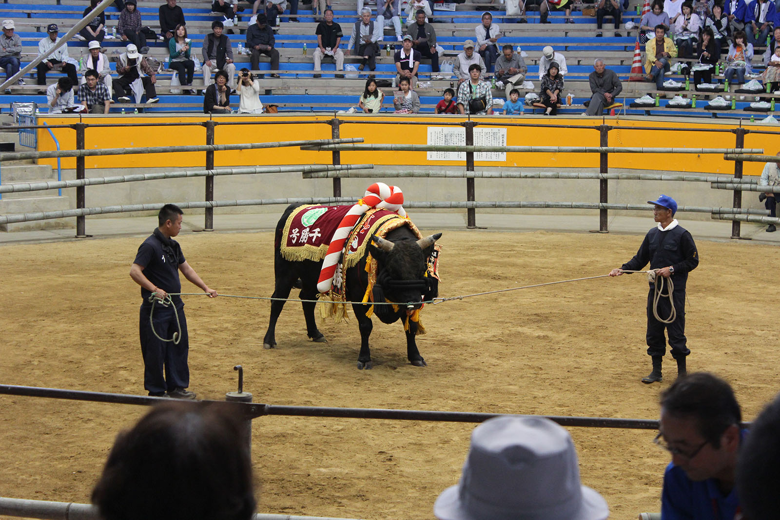 そういう風に育てられているからだろうか、入場してきた牛同士が、何の躊躇いもなく角を付け合せて勝負が始まる。 早い試合だと15秒程度、今回一番長い試合は24分くらいかかった。