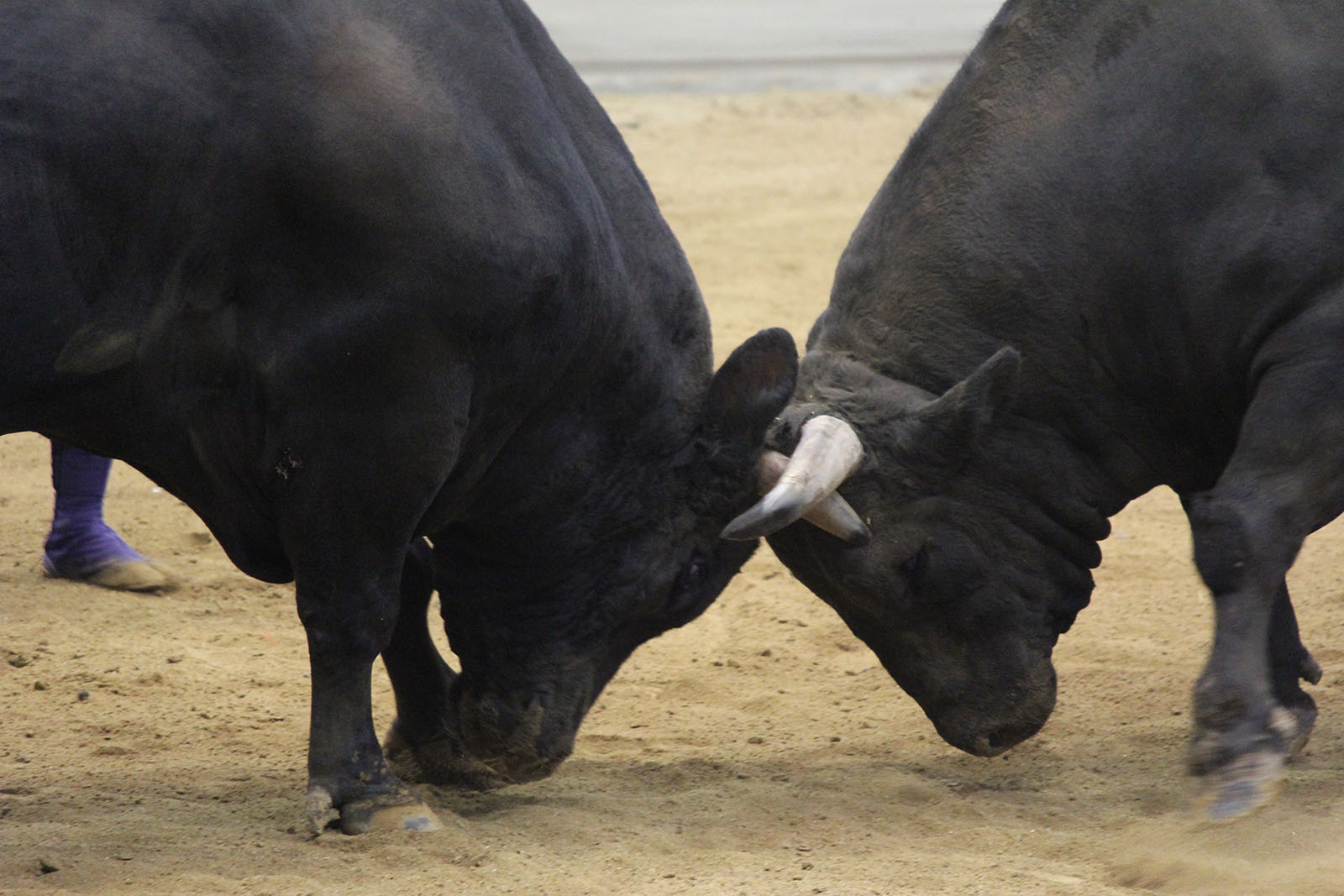 そして闘牛が始まった。 スペインの闘牛ではなく、牛対牛の闘牛。 相撲のような感じ。 勝負は単純で、逃げたら負けというルール。