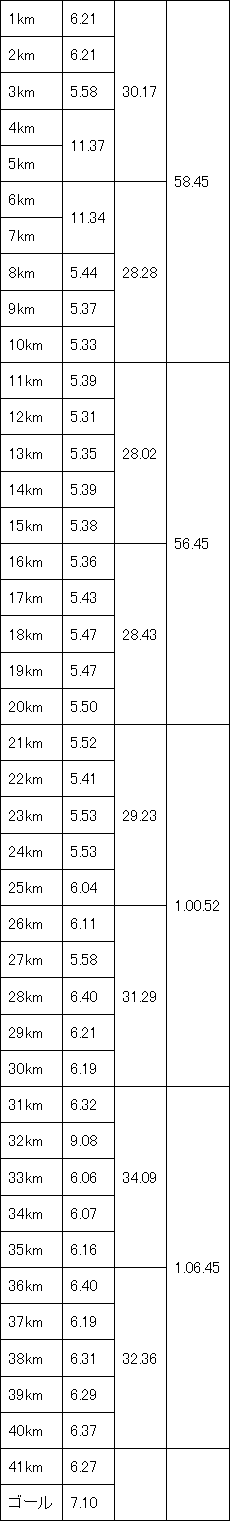 ゴールまではまだ10kmもあるが、10kmしかないと考えるべきだと思い、なんとか走り出す。 奇跡的に足は復活して、35km地点くらいまでの4kmはキロ6分10秒くらいにタイムを戻すことができた。 35kmまで来たら残り7km。 普段走っている6kmコースにたった1km足すだけ。 6kmコースなんて走るのあっという間じゃないか。