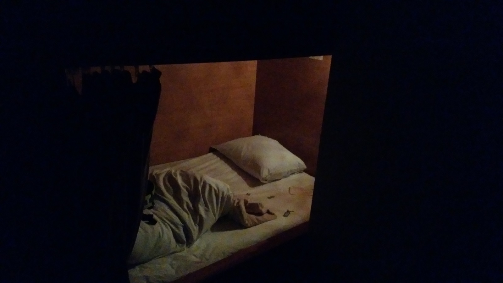 8階のフロアにおりたら真っ暗。 もう深夜1時なので消灯なのだろう。 ただ、813の場所がわからない…… 酔ってる中、スマホでなんとかマップを見つけて、813の場所を発見。 ロッカーがあるらしいけど、真っ暗でどこにあるかわからない…… 壁の穴の中にベッドがあるので、とりあえずそこに荷物を放り込んで一息つく。 が、寝てしまうのでシャワーを浴びなくては。 ロッカーがわからないので、着替えと貴重品を持ってシャワーを浴びに行く。 が、シャワーの場所もわからない。 フロントで聞いたら「地下」とのこと。