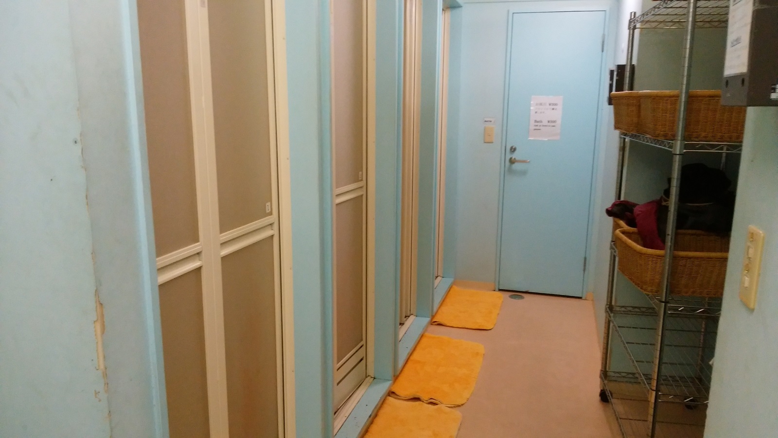 壁に無理やりつけただけの棚があって、そこが荷物置き場になっている。 シャワー室は4つ、お金払えば浴槽も使えるらしい。