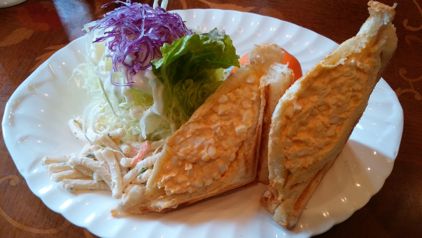 たまごのホットサンドを注文し、出てきたモーニングはすごかった。 ホットサンドのパンは分厚く、玉子がはみ出るほど入っている。