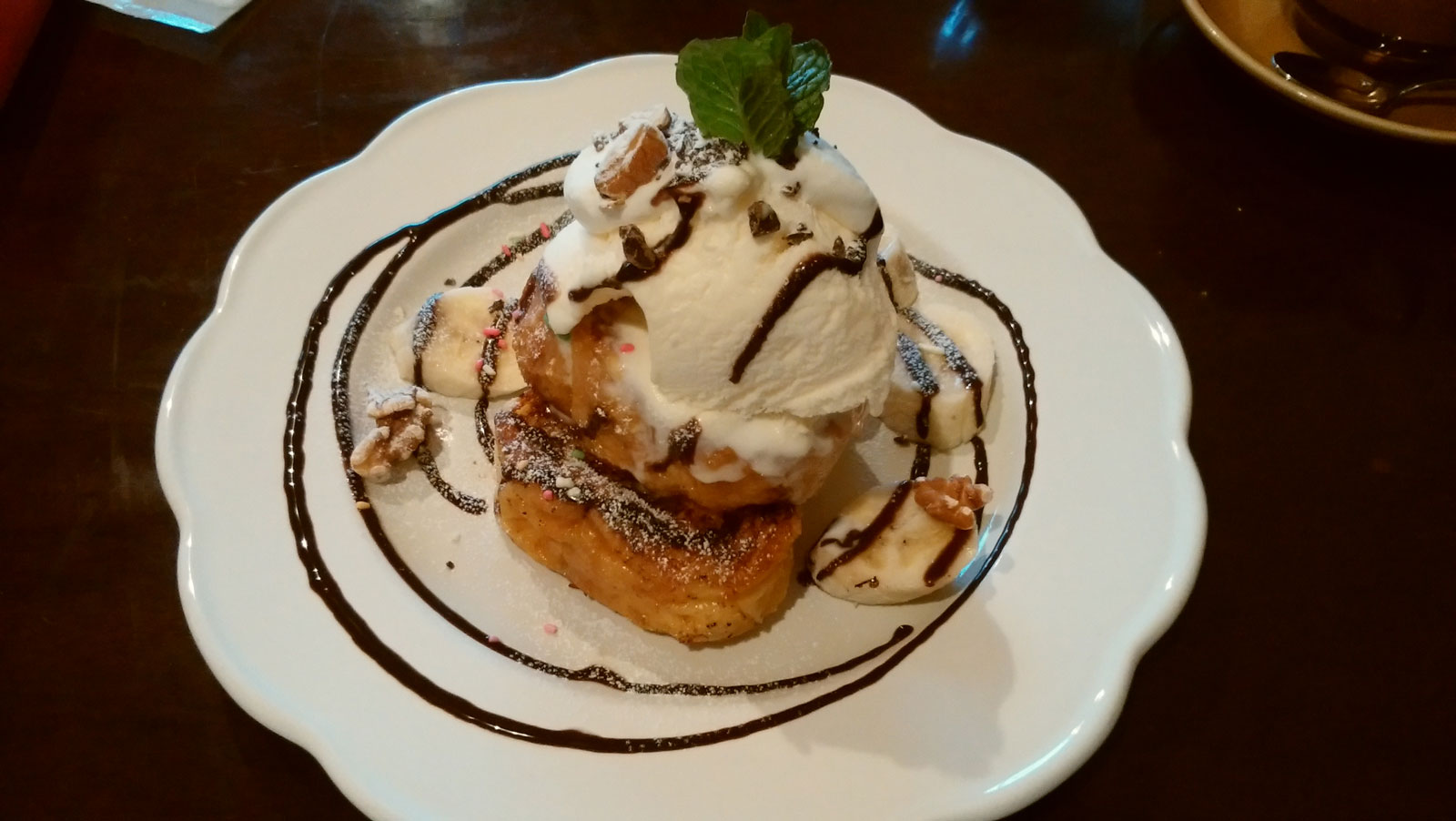 夕方になって、どうしてもお腹が空いてきたので「トリッチトラッチ」へ。 夕飯が近いのでそれほどガッツリはいらないな。 フレンチトーストのバナナチョコレートみたいなものを注文して1時間くらい時間を潰す。