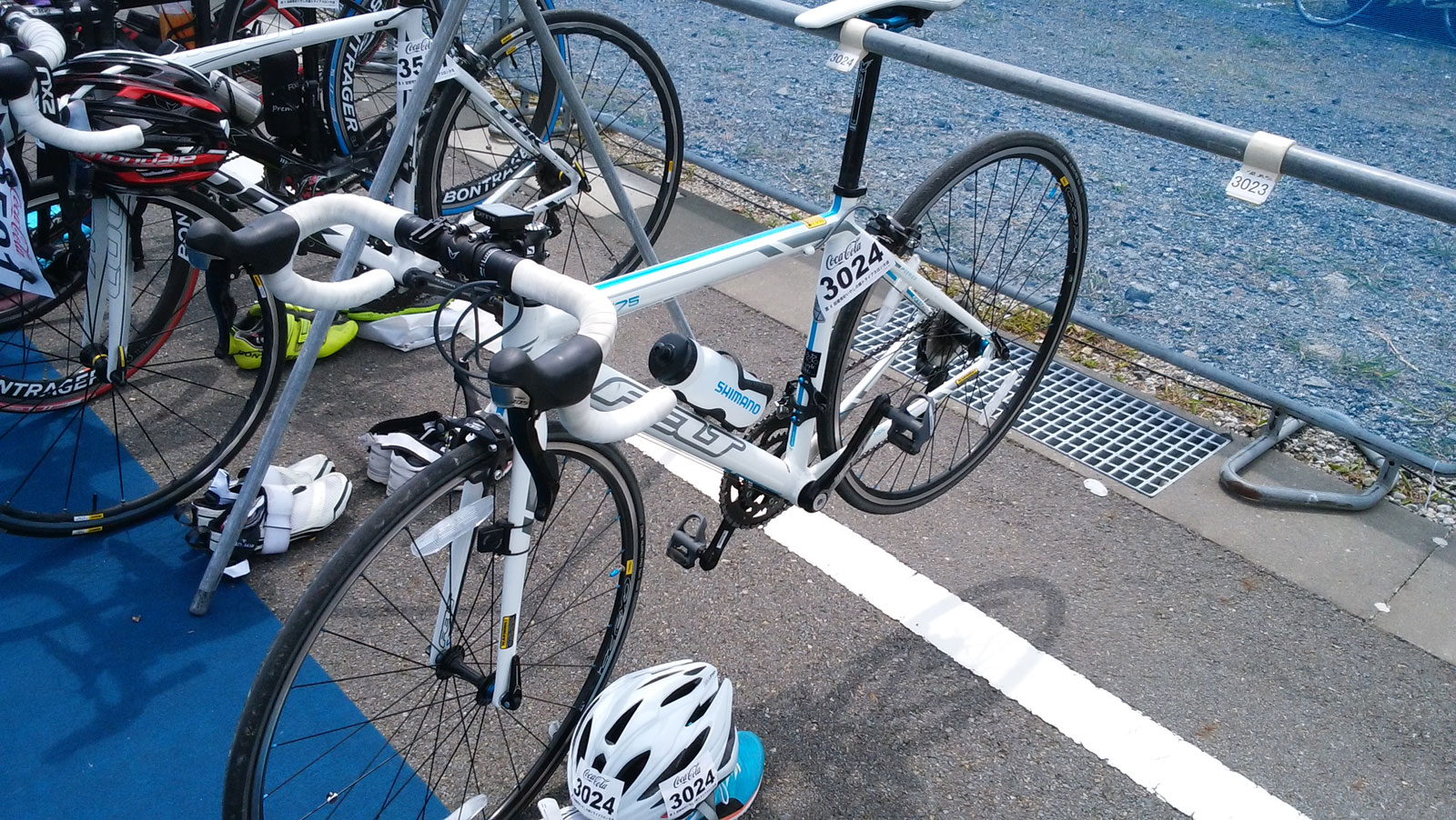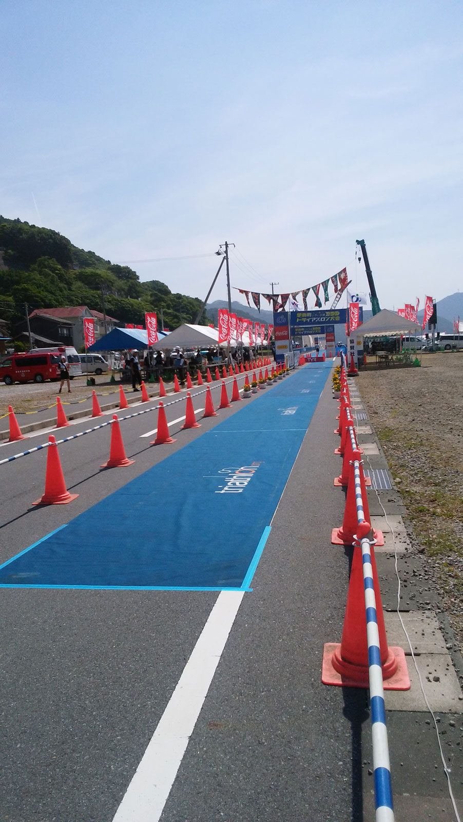かなりフラフラになりながらトランジッションエリアに向けて走っていく。 走りながらウェットスートの上を脱いで、自分の場所についたら座り込んで下も脱ぐ。 タオルで足を拭いて靴下、ビンディングシューズを履く。 トライアスロンウェアは持っていないので、上に来ているのは参加賞のピンクのTシャツ。 ウェットスーツの下に、前後にゼッケンをつけたこのTシャツを着ている。 海水でビショビショだがすぐ乾くだろう。 ヘルメットをかぶって、バイクをおろして、乗車ラインに向けて走っていく。 乗車ラインを越えてからバイクに乗車。 これから地獄のバイク40kmが始まる。 出だし早々上り坂、この上り坂が3km続く。 ギアを一気に軽くして20段あるギアのうち、既に下から2段目。