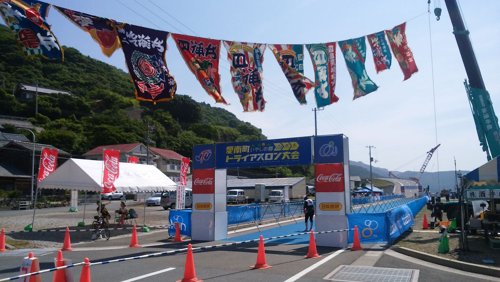 ランの出だしは上り坂から始まる。 狭い路地で急な上り坂を走っていく。 バイクからランへの体の切り替えが出来てなくて、ものすごいフラフラだし息も上がる。 1周目は調整になりそうだ。 路地を越えた後は元有料道路の広い道になるが、まだ上り坂が続く。 ゆるやかになったが辛い…… そして600mのトンネルへ。 トンネルの中は無風でものすごい暑かった。 トンネルを抜けた先で給水ポイント。 水を2つ取って、1つは飲み、1つは頭にかける。 給水後は下り坂が続き、下り坂が終わると平坦な道でゴール前まで。 これで1周3.3km、これを3周する。 この時点での通算タイムは公式の時計があったので、把握できた。