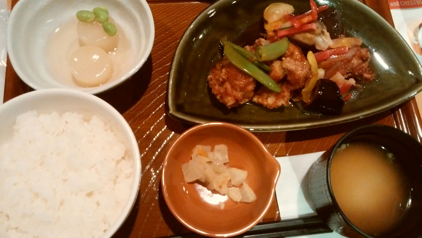 夜ご飯は、ガストで妻たちと合流して「若鶏と彩り野菜の黒酢あん和膳」を食べる。