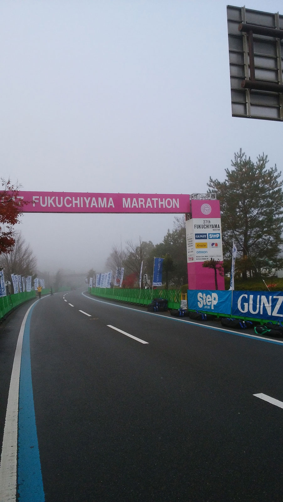 夜、寒くて何回も目が覚めてしまった。 6時半くらいから半分起き出して、7時15分に完全に起床。 駅にはもう列車が到着しており、福知山マラソンに向かう人達で溢れかえっていた。 駅にあるセブンイレブンでおにぎりと温かいお茶を買い、車の中で食べる。 家からバナナも持ってきているので、それを1本食べる。 着替え等をして、7時45分くらいに無料バスに乗り込んで8時くらいには会場に到着。