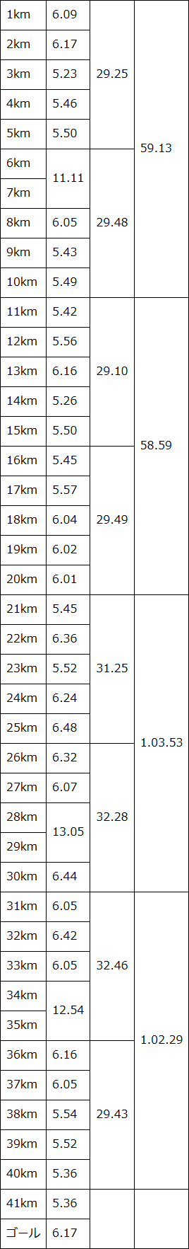 35kmの地点で3時間33分くらい。 残り7kmでキロ6分だとしたら42分+195mが1分なので、4時間16分。 このペースで行くことができれば、ギリギリ4時間16分台でゴール出来そうだ。