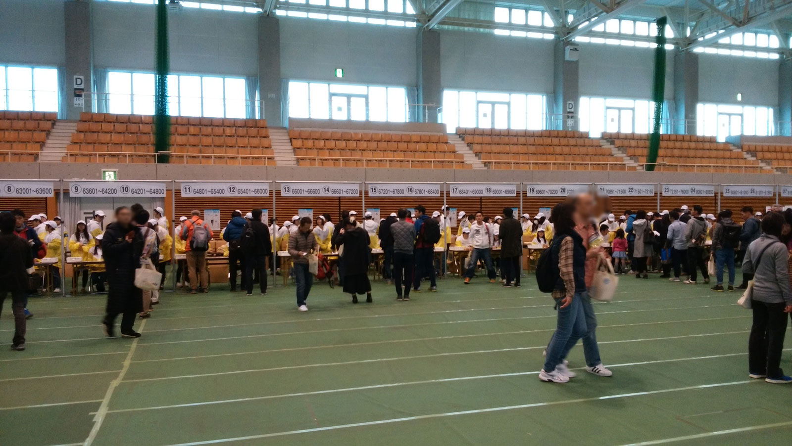 受付会場のZIPアリーナまでは徒歩20分くらい。 みんな受付でそちらに向かったり、帰ってくる人がいるので、歩道は大混雑だった。 妻の社長の受付も依頼されており書類を預かっている。 2名分の受付を済ませて、参加賞のTシャツをもらってから、岡山に住んでいる元同僚と落ち合う。