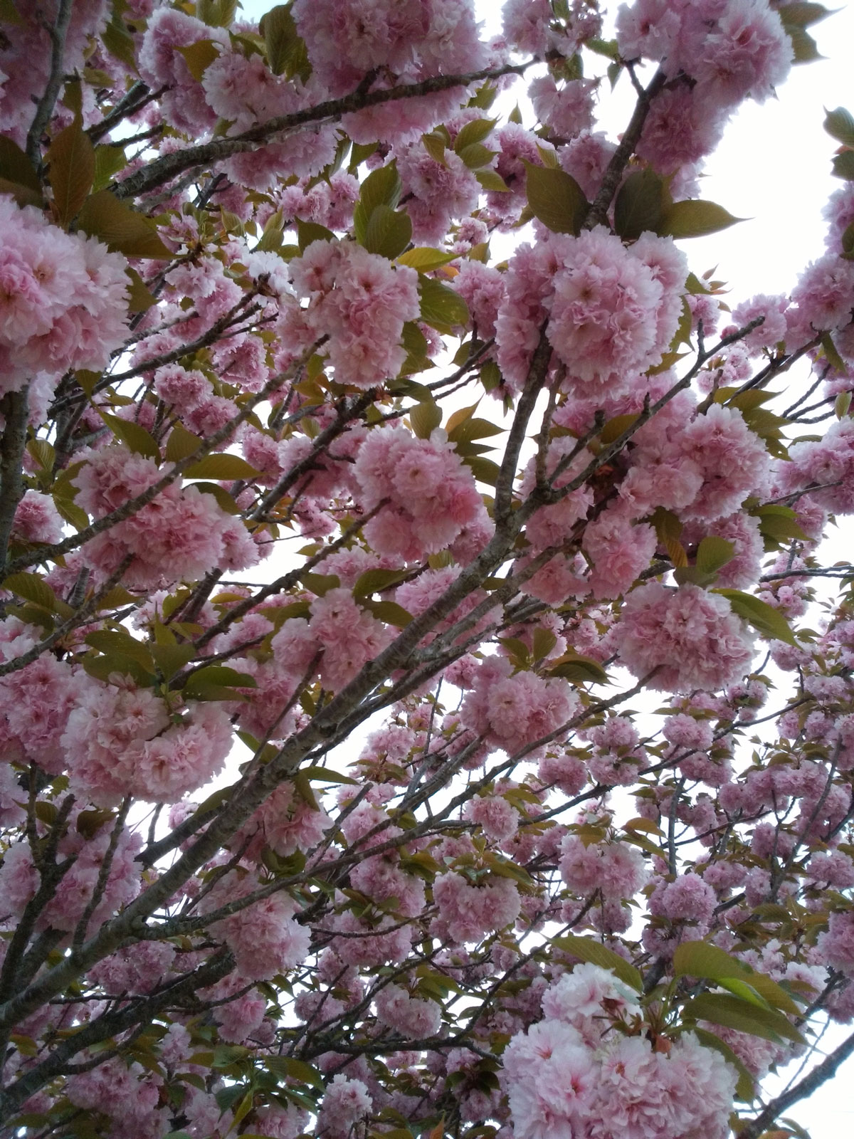 夕方、雨の合間に三女と池の周りに散歩に行ってきた。 行けの端には、お地蔵様の祠が作られていて、いつもそこで挨拶をして休んだりしているのだけど、その祠の横に、桜の木が生えている。 普通の桜はもう散っちゃっているのだけど、この桜は満開だった。 植物は全然興味が無くてわからないのだけど、桜の種類が違うから、咲く時期もずれているのかな?