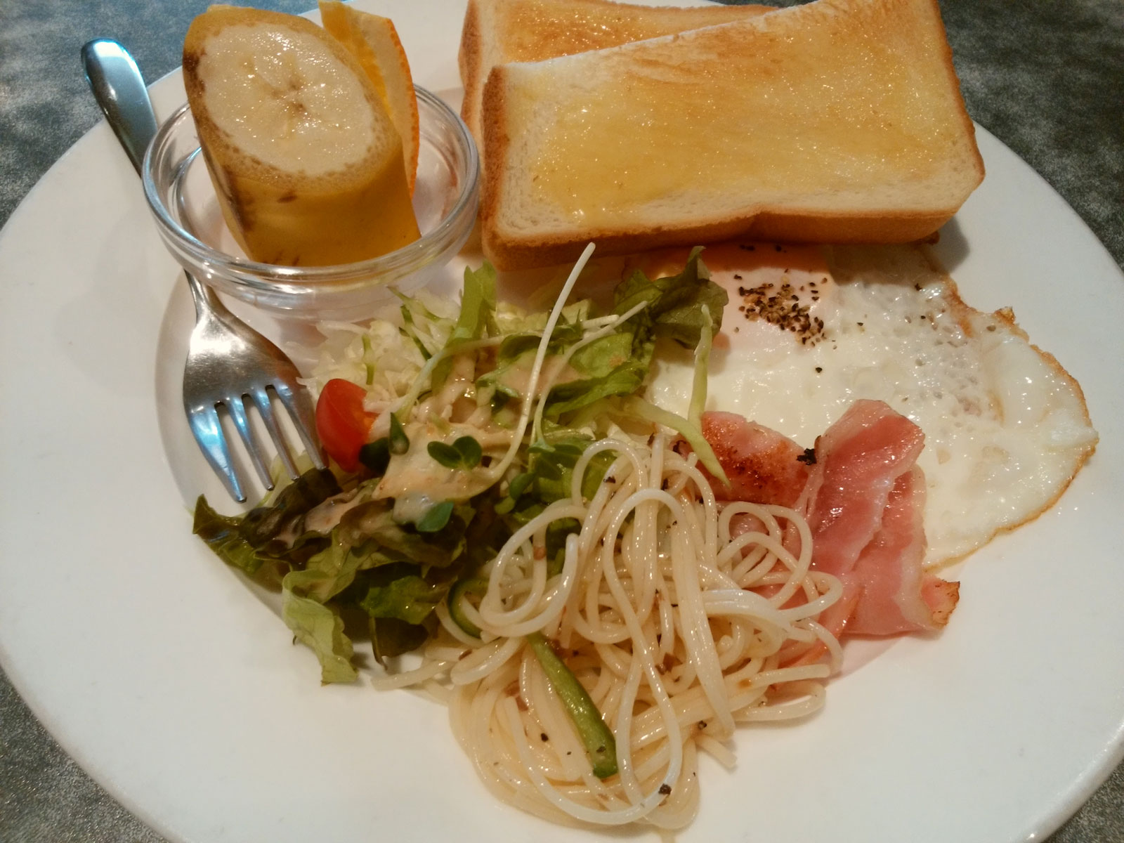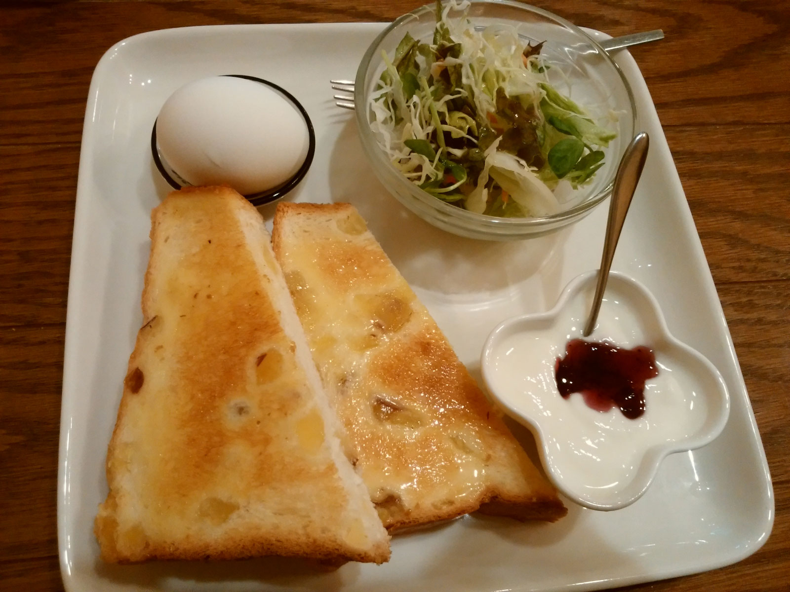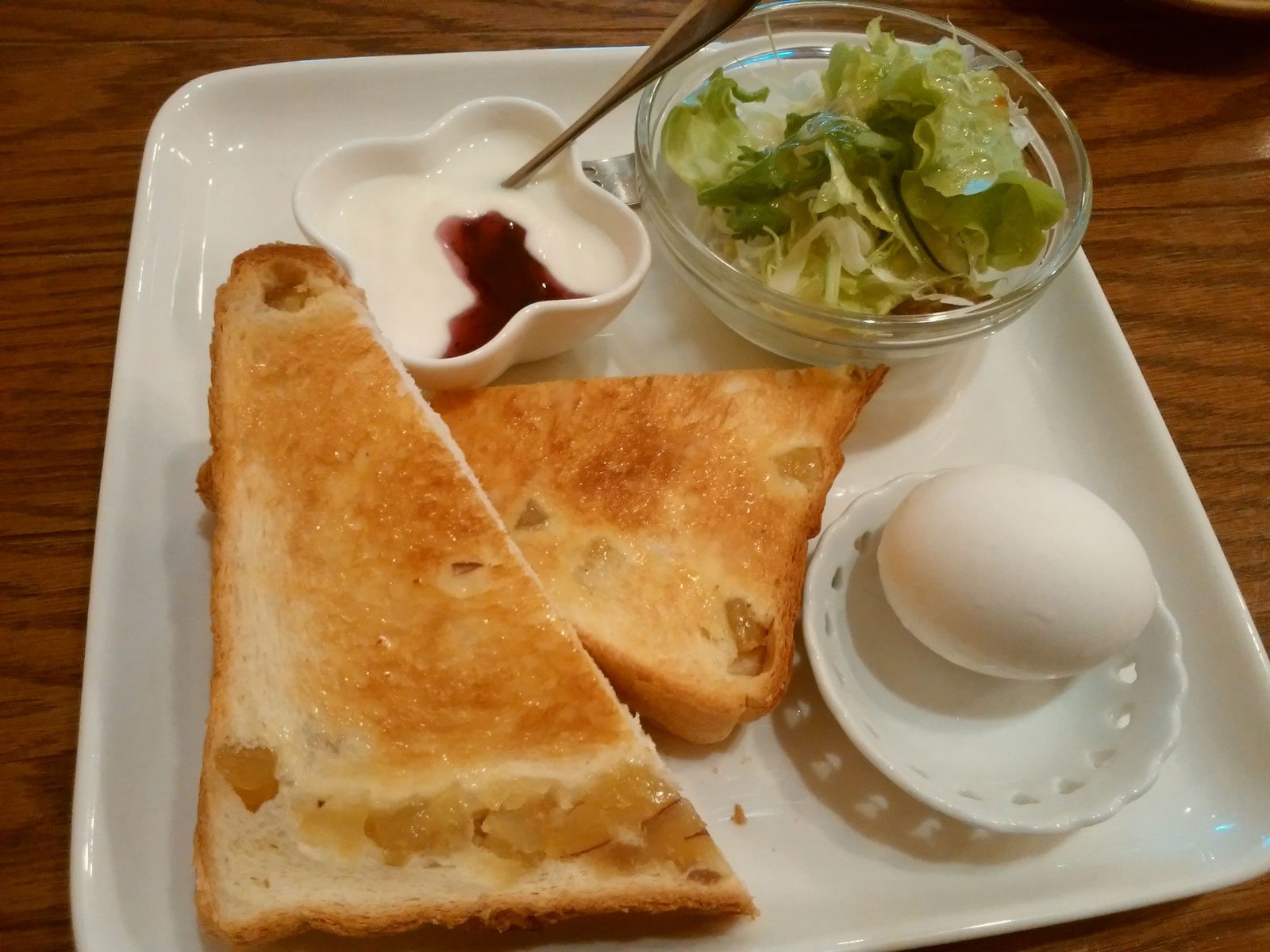 朝は「トリッチトラッチ」でモーニング。 お芋パンとホットコーヒーでお腹を満たして仕事に向かう。