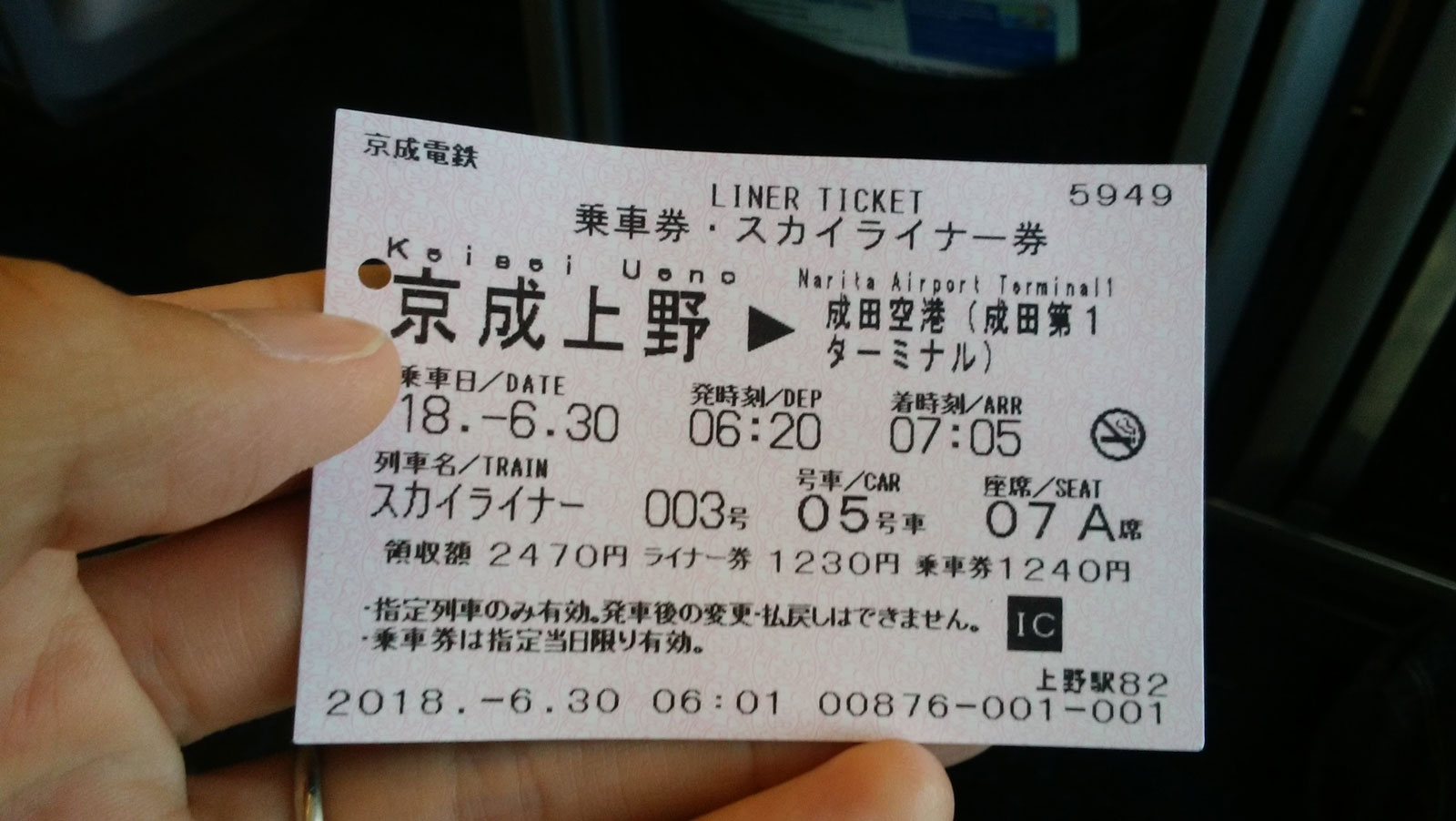 予め電車の時刻等を調べておらず、上野についてから成り行きでいいや、と思っていたのだけど、上野発の電車は快速しかなくて、成田空港まで1時間半くらいかかる。 時間的には問題ないのだけど、1時間半もひたすらと電車に乗っているのは苦痛なので、スカイライナーに乗ることに。 運賃が1,240円なのに対して、特急券が1,230円、ほぼ倍の値段になってしまうのだけど、これなら新幹線みたいに座りやすいシートだし、時間も50分くらいで行くことができる。
