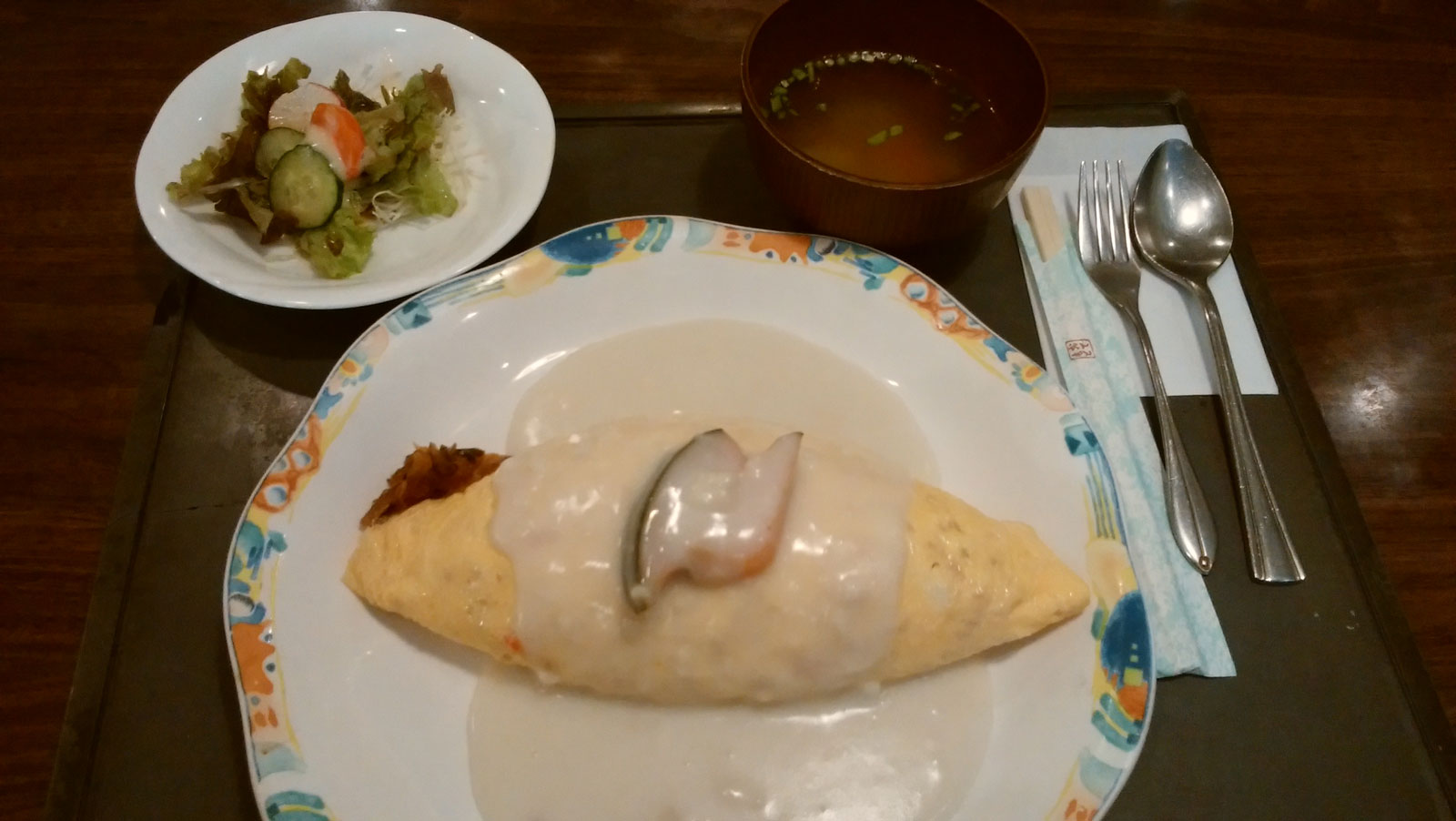 岡山着いてからは、とりあえず岡山大学の方に歩いていきながら、お昼ご飯を食べる店を探す。 「奥の細道」という喫茶店があったが、ここは前来たことあるのでパス。 その少し先に「カフェレストラン はちのす」というお店があったので、そこに入ることに。 接客は80歳超えてそうなおばあさんで、歯が1本しか生えてなかった。 ランチ+ドリンクで800円だった。 ランチはオムライスのホワイトソースがけみたいなやつ。 初めて挑戦する不思議な料理だったが、ホワイトソース自体には味があまり付いていなかった。 上に乗っていたカボチャがとても美味しかった。