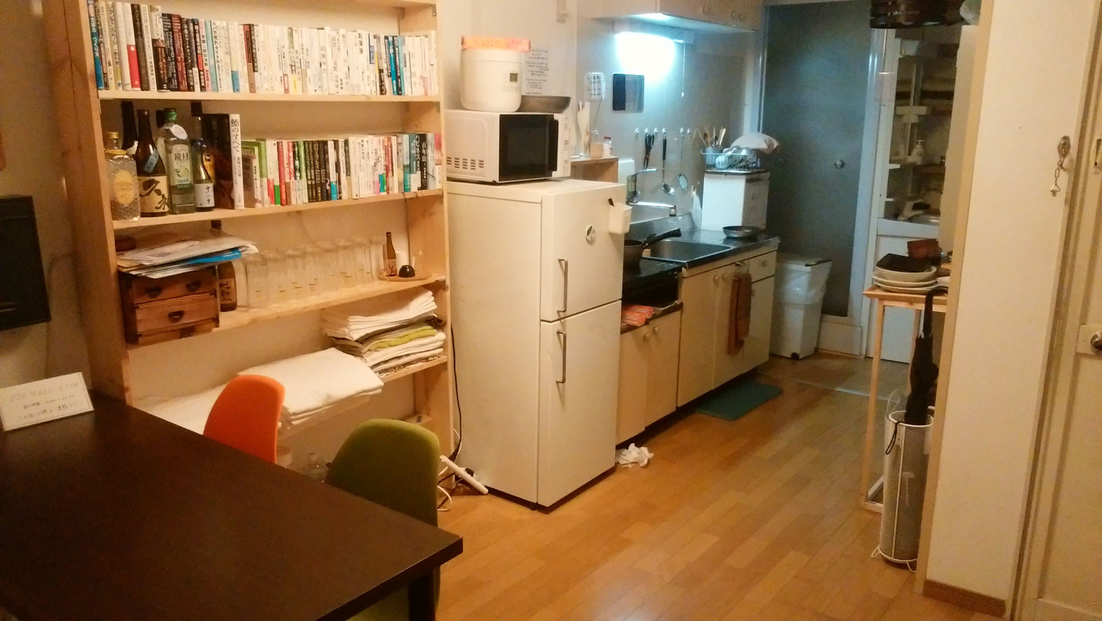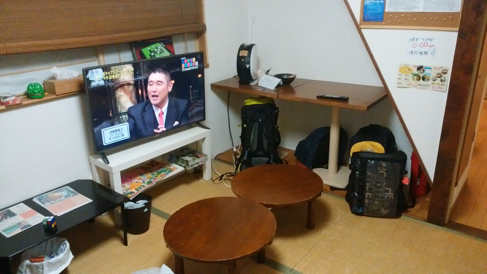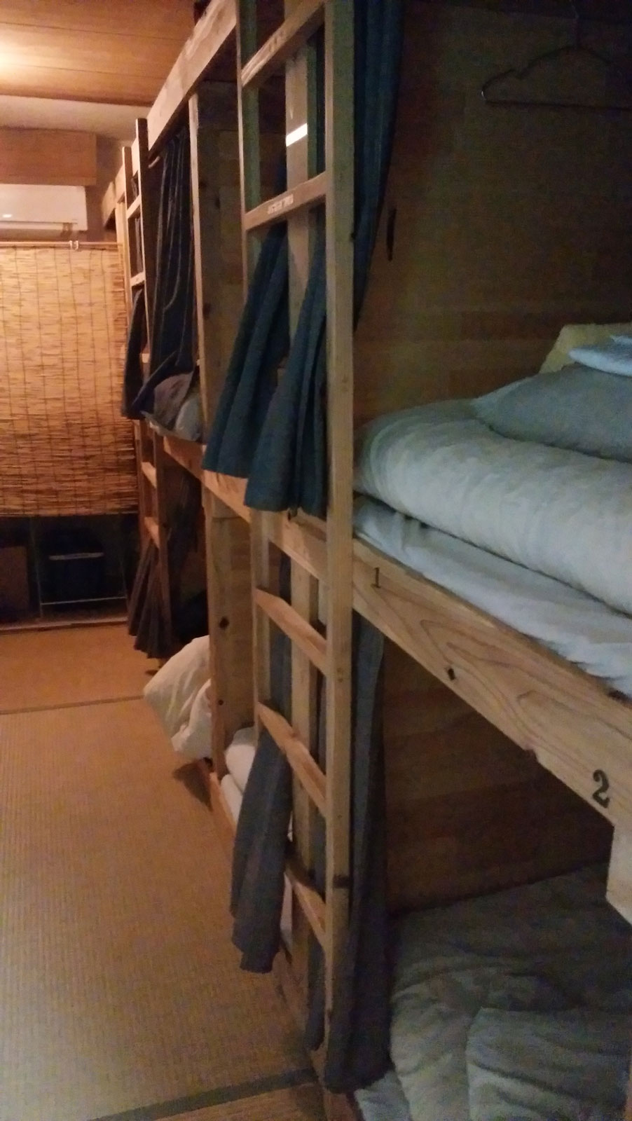 建物の中は、共有スペースの台所・和室があり、その隣が寝室。 木の板を組み合わせて作られた、手作りのカプセル型の就寝スペースが8つ作られていた。 シーツとマクラカバーはセルフサービスらしい。 反対側にはシャワールームとトイレが2つ。 結構狭く、寝室が6畳、和室が6畳、台所が8畳くらい? もう夕飯食べ終わってるし、明日朝も早いのでこれから外出する気にはなれない。 早めにシャワーを浴びて、24時前には寝ることにする。 他の宿泊者と交流があるかと思ったが、3人組の人は釣った魚を調理してて食べ終わったら外出してしまったし、もう1人いたのだけど、その人はシャワー浴びて自分のスペースに閉じこもってしまっていた。 満室だったので、他の利用客もいるのだが、全員外出中だった。