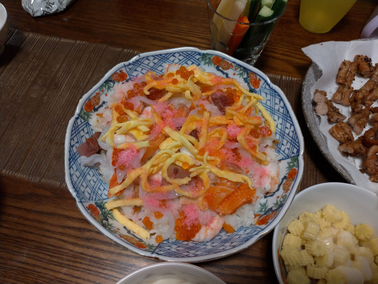夜はひな祭りなのでちらし寿司でも作ることにした。 家にちらし寿司の素があったので、ほとんどそれに頼った感じなのだが。 錦糸卵は自分で作って、無頭エビの下処理をして茹でて、ちらし寿司用の刺し身詰め合わせを購入して盛り付けて、おぼろを購入して盛り付けてちらし寿司は完成。 ベビーコーンでも乗せようと思って茹でたのだが、思ったより固くて味もトウモロコシぽかったので、ちらし寿司の味と合わない感じがしたので乗せるのはやめた。 ちらし寿司の素のパッケージ裏のレシピには「ベビーコーン乗せてもいい」と書いてあったのだけどな。