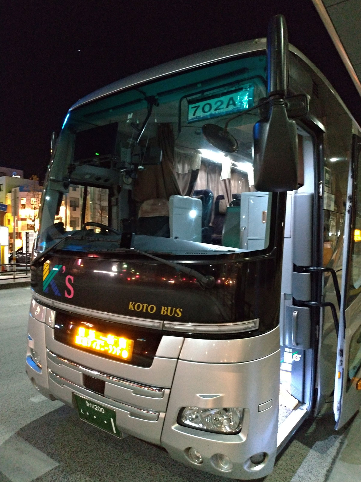 今日は高松駅を20時半に出発するバスで横浜に向かうので、夜がかなり慌ただしかった。 電車で高松駅まで行くので、19時半には家を出発しないと行けなかったのだが、直前の19時15分くらいまで仕事の電話がかかってきていたりで、ドタバタ状態での出発になってしまった。 忘れ物はないよう、予め荷物はまとめた状態で準備しておいたので大丈夫だとは思うが……