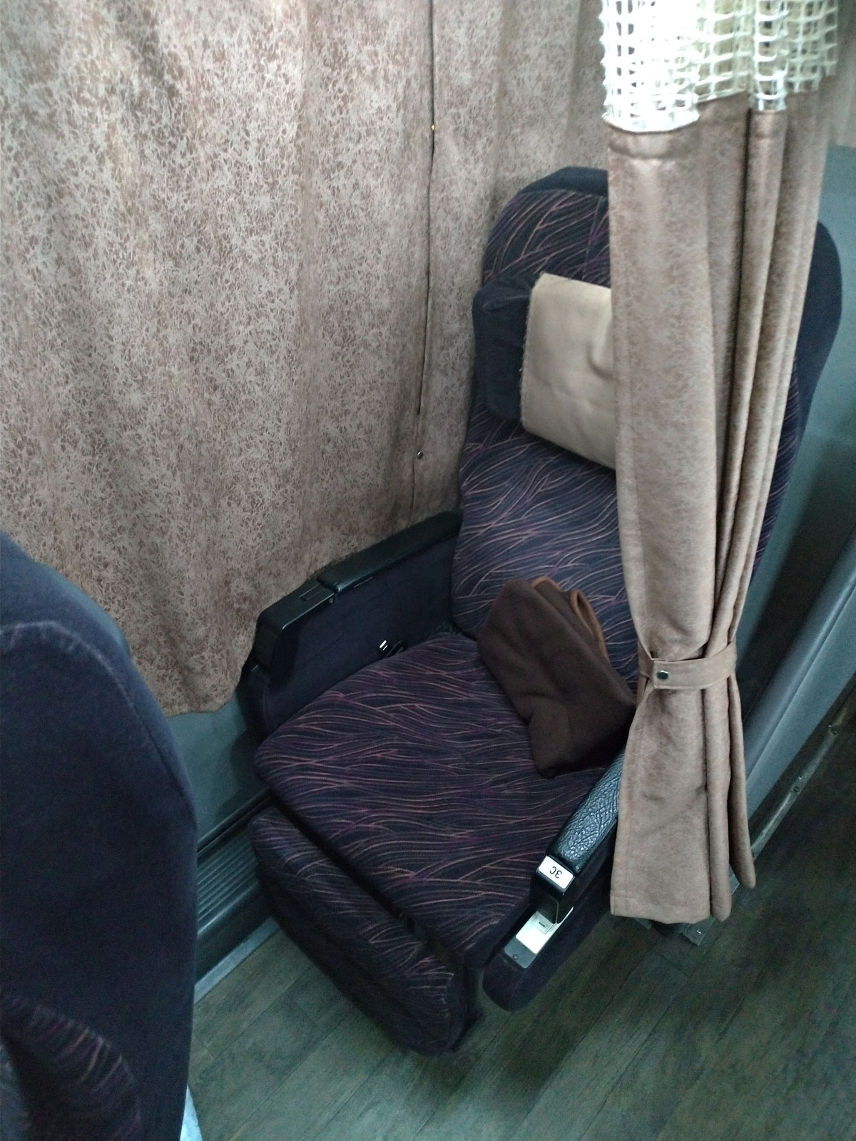 普通のシートと比べると1,000円高いのだが、窓際なのとカーテンがついているので、結構個室っぽい感じにはなる。 バス移動は長いので、少しでも快適な方がいいので……