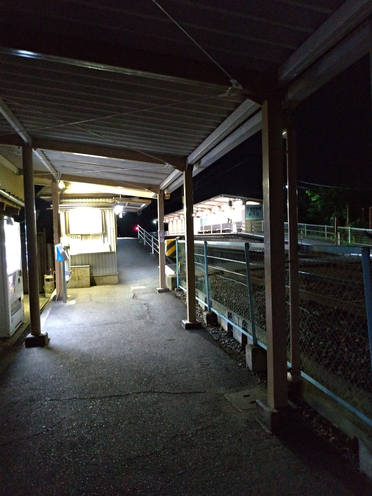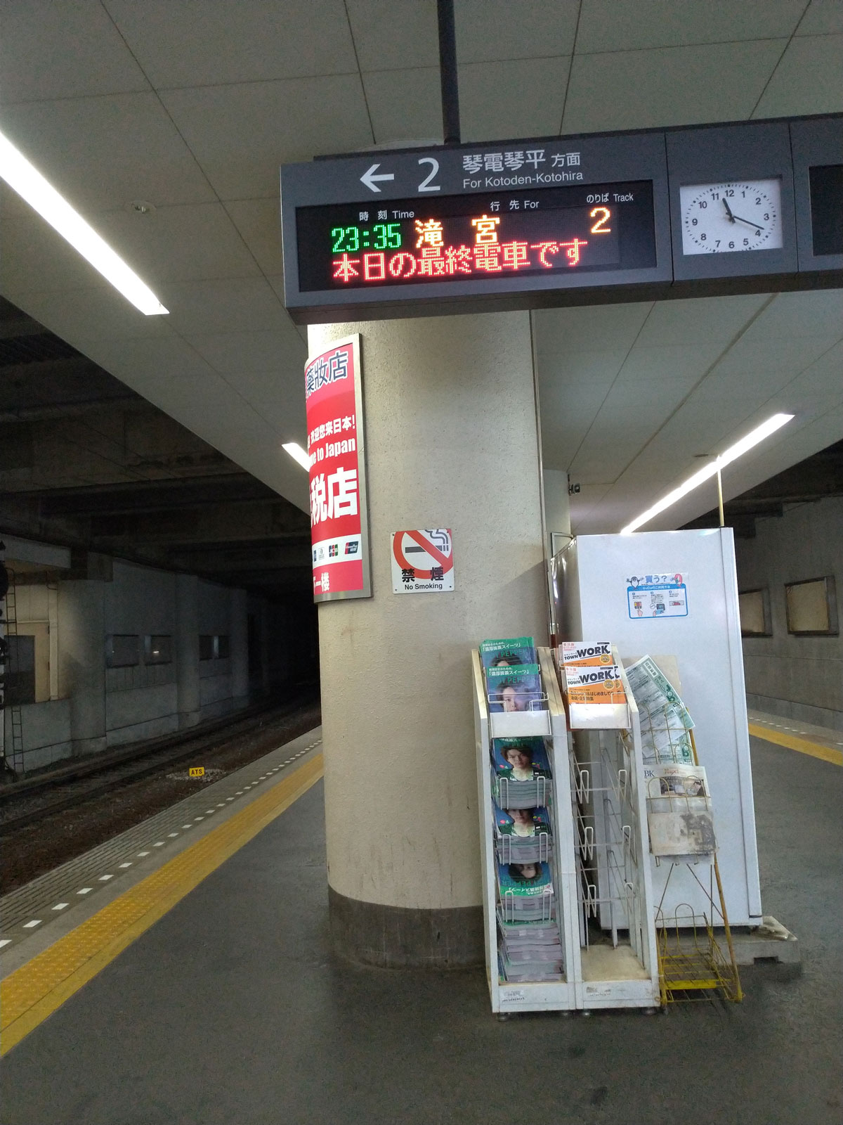 終電は23時35分、滝宮行きの電車だ。 終電はそれほど混んでおらず、席に座ったらすぐに寝てしまった。 そして、パッと目が覚めたら電車内には3人しかいなかった。 1人は泥酔して横たわって寝ている女性、1人は普通のサラリーマン。 そして、現在地はどこだ?? 外の景色を見るが、暗いし見慣れない風景なのでわからない。 右手にローソンが見えたのだが、ローソンなんてあったかな…… 完全に寝過ごしたと思ったのだけど、ローソンが右手に見えそうな部分は、円座駅を越えた当たりかなぁと思っていた。 だが、円座駅どころか、次の駅は陶駅だった……
