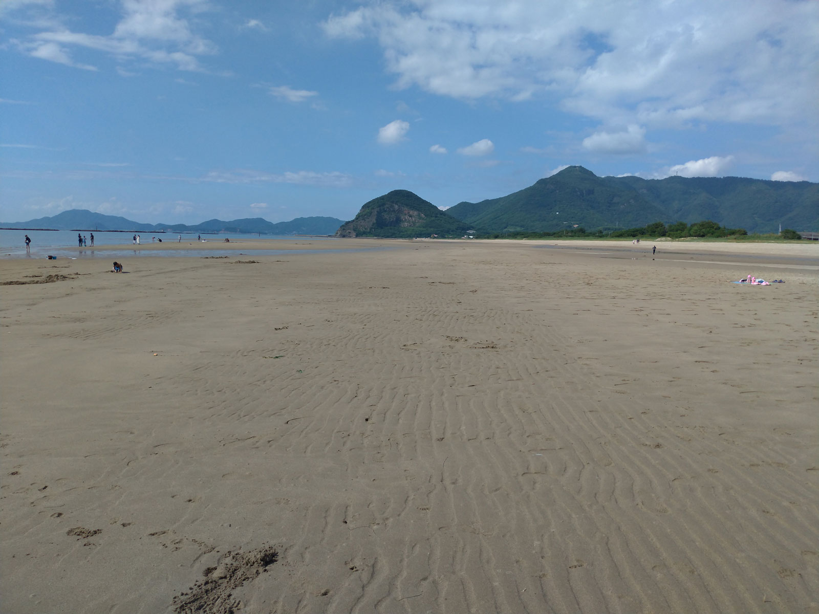 今年のお正月にクロスカントリー大会後に、少しだけ有明浜を歩いたのだけど、その時はゴミの多さに驚いた。 それが今は、ゴミはあるがほとんど目立たない程度しか落ちておらず、今日は来た時間が遅いので利用しないが海の家もオープンしている。 そして天気は晴れで暑い、まさに海の日にピッタリな天候だ。