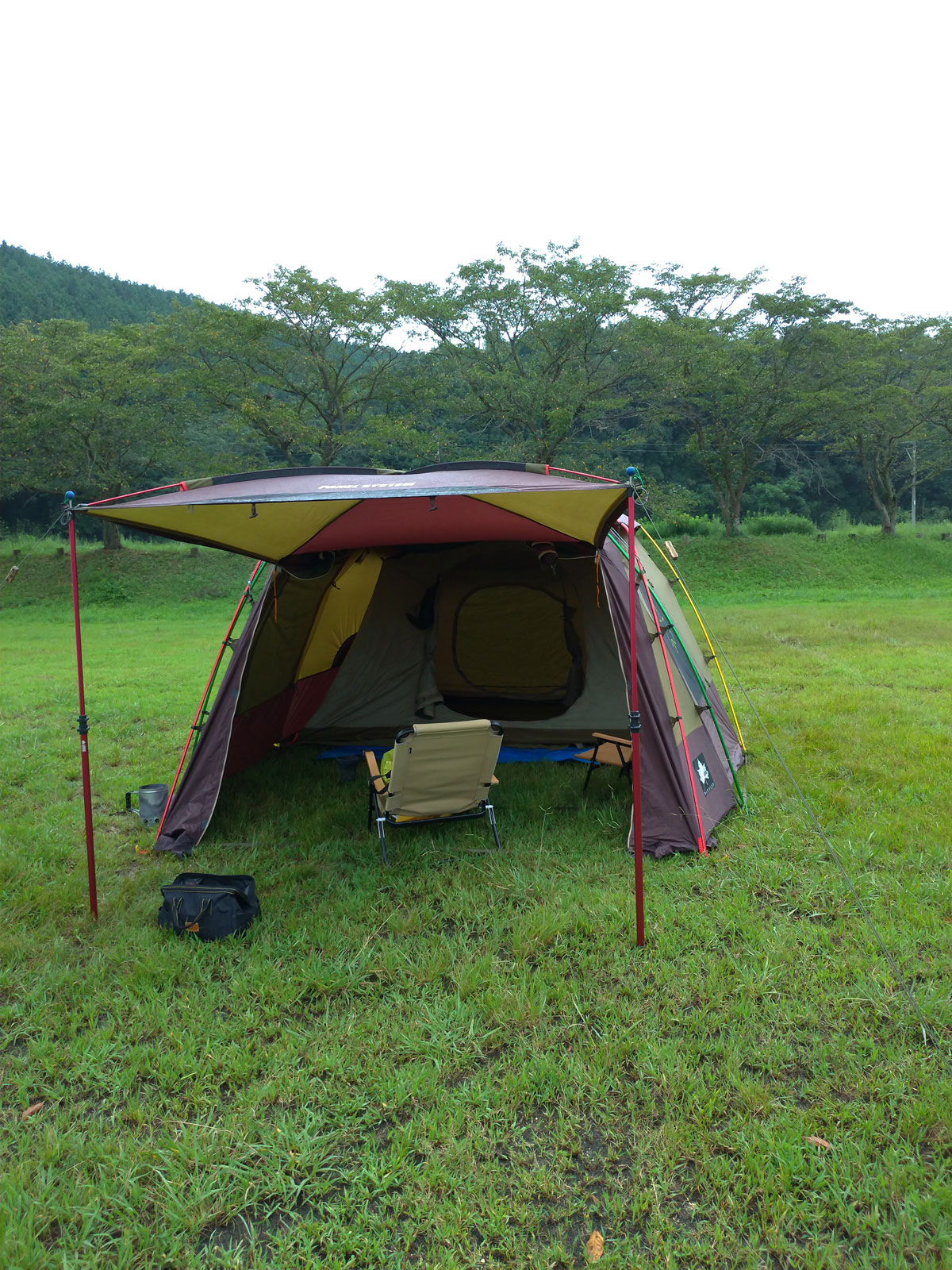 小雨の降る中、友達の持ってきたテントを組み立てる。 LOGOSというメーカーのタープの中にテントがついたような商品、型番はわからないけどHPで見たら「プレミアム PANELグレートドゥーブル XL-AF」と全く同じ感じだった。