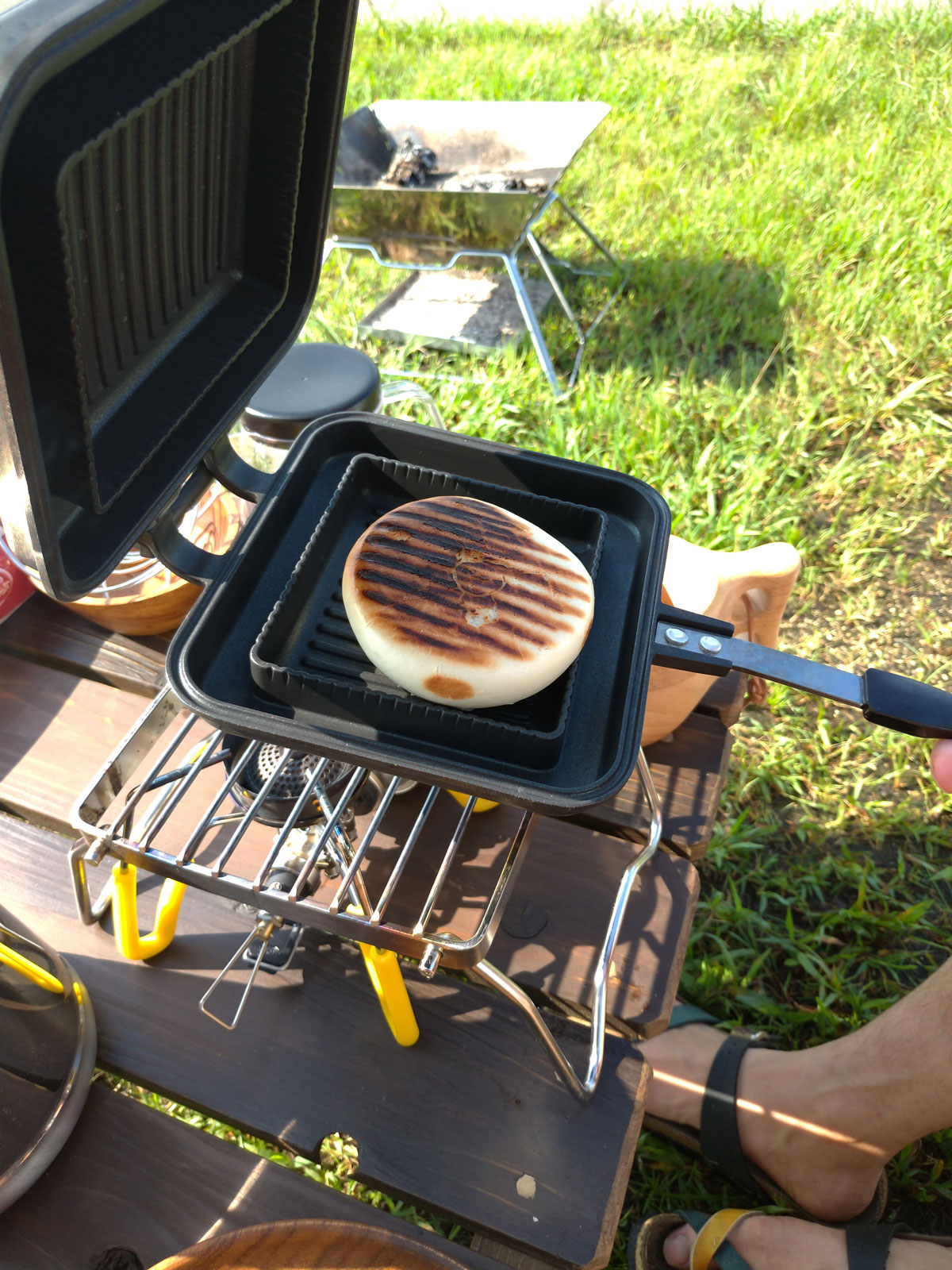夜寝ている時は肌寒く、持ってきたタオルケットにくるまって寝ていた。 が、朝は日差しでテントの中は高温になっていて、7時半くらいには目が覚めてしまった…… 朝ごはんはホットサンドメーカーで肉まんを作ってくれて、これが意外に美味しかった。 と、ここ3週間くらいコーヒーを断っているのだけど、せっかく入れてくれたので飲むことに。 コーヒー豆をハンドミルで挽いて、フィルターに落として入れてくれる、手が凝ってるな。 自分の日記の写真は適当だが、背景綺麗にしたり構図を考えたりすると、こういうのもインスタ映えになるらしい。