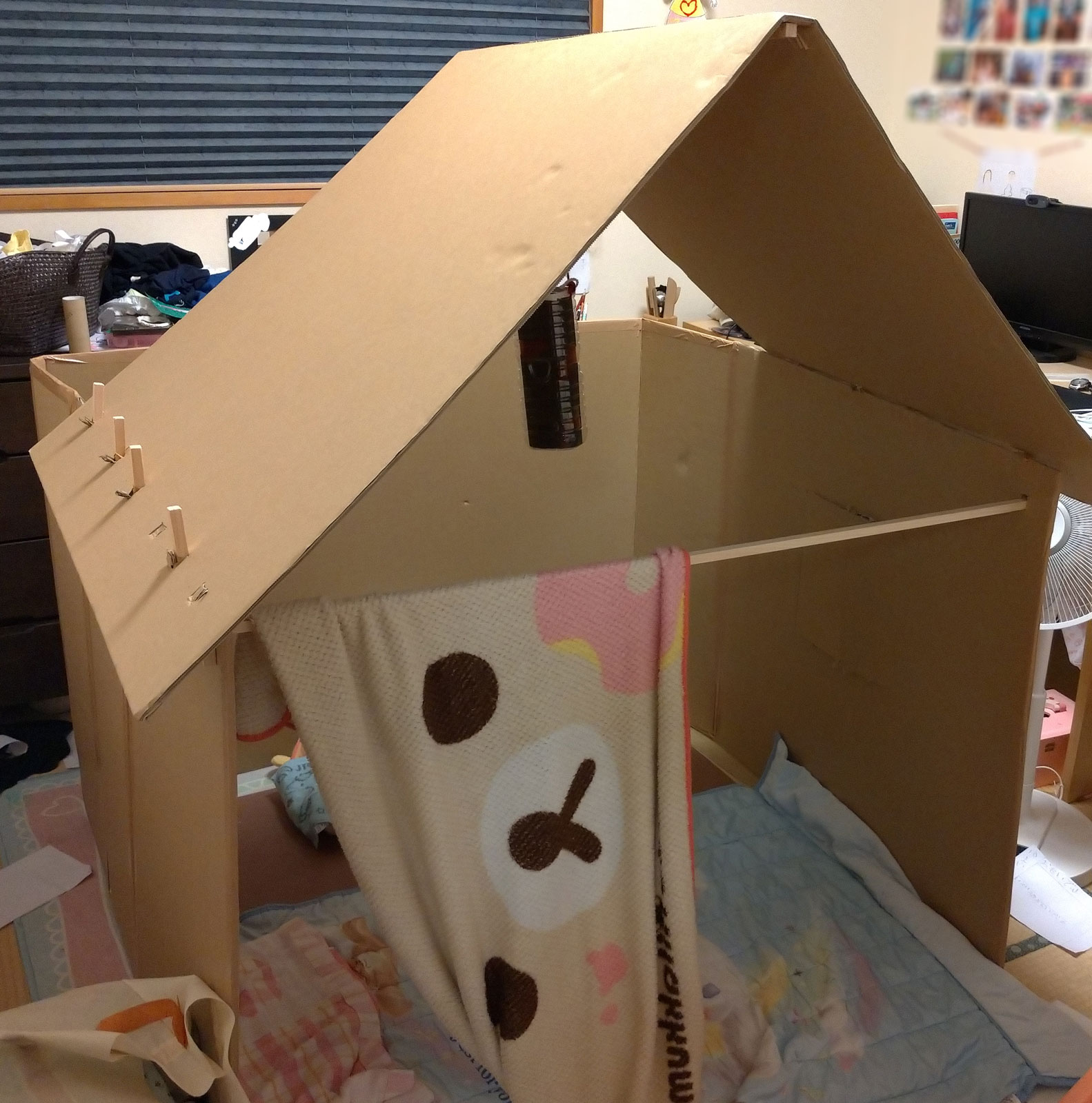 その固定用に通した木の棒にタオルケットなどをかけてカーテン代わりになった。 壁に窓的なものを作って、とりあえず完成したが、部屋の空きスペースの8割位を専有され、部屋の中央に鎮座するので、部屋が非常に狭くなった。 行き来するだけで大変。