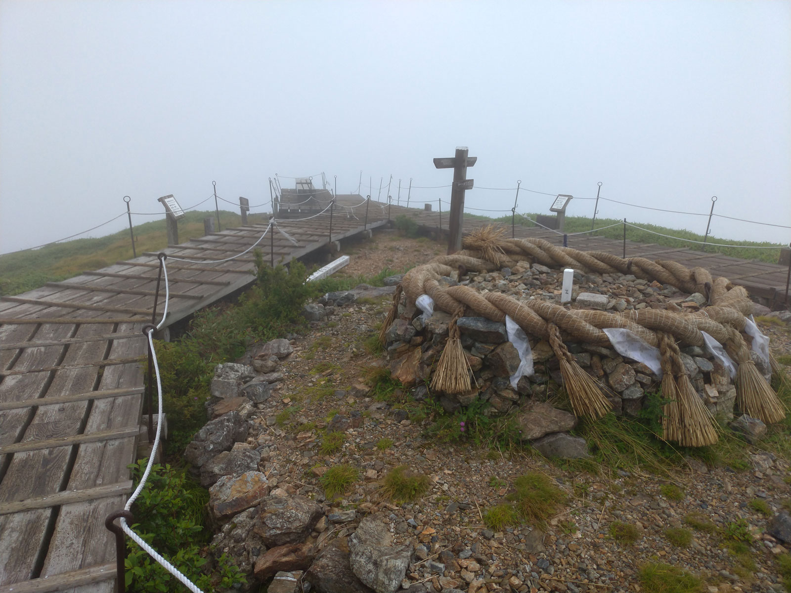 山頂が近くなると雲に覆われて、風が出てきて、雨が降っているような感じになってきた。 山頂広場は風が吹き荒れ、子供たちは「寒い」と行っていたので、山頂の看板を見に行って、すぐに戻ってきてしまった。