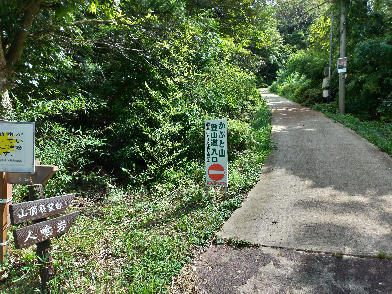 まずは目の前の久美浜湾の東側にそびえる「兜山」へ。 ナビ見たら車で行けそうだったので行ってみたら「道路が狭いので車は通行禁止、登る場合は登山道を」と書かれていた。