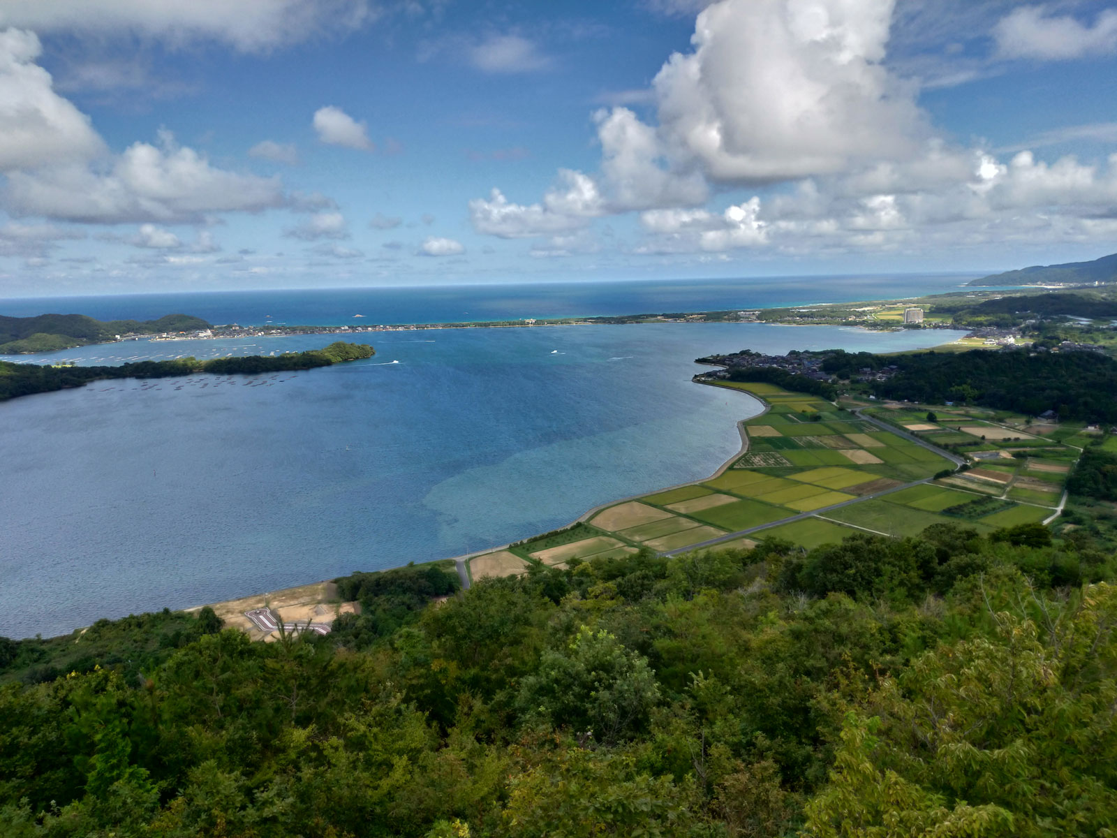標高191mの低い山だけど、今の体の状況で登れるだろうか…… 山の久美浜湾側が登山口になってるので、そこまで車で移動して、500mlの水のペットボトルとスニーカーで登山開始。 「20分くらいで登れる」と書いてあったのだが、最初は坂、途中からは階段になっていて、今の足の状況には非常に厳しかった。 20分どころか30分くらいかかって、ようやく山頂に到着。 山頂からは久美浜湾と小天橋が見える素晴らしい景色。 苦労して登ってきて良かったと思った。