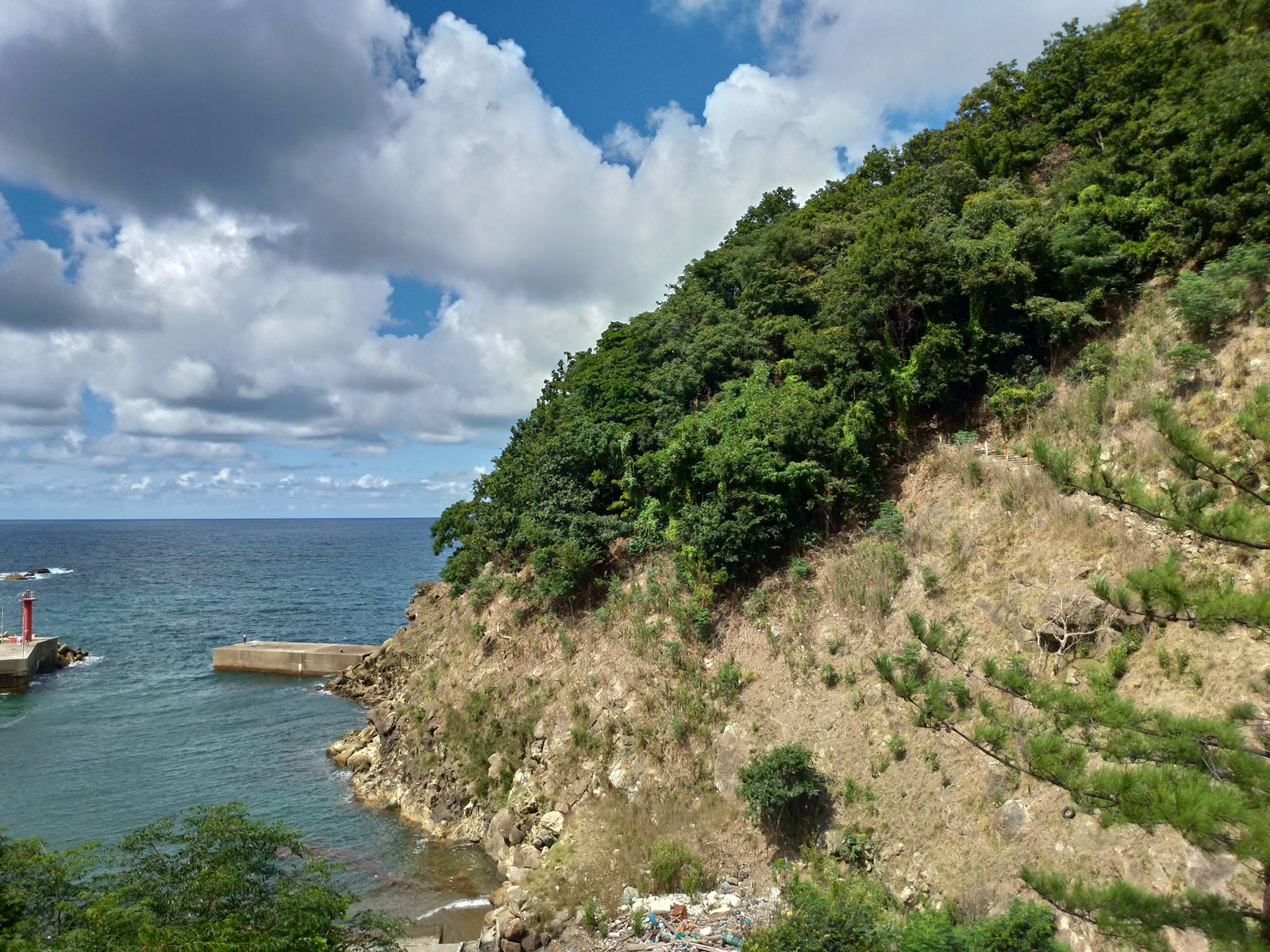 続いて15km地点くらいだろうか、七竜峠への上り坂が始まる海辺に、謎の階段があるのを発見していた。 そこには何があるのだろうか……と思って、車を止めて歩いていったが、最終的には五色浜という海水浴場に出るだけだったので、20分くらい歩いて、また戻ってくるだけだった。