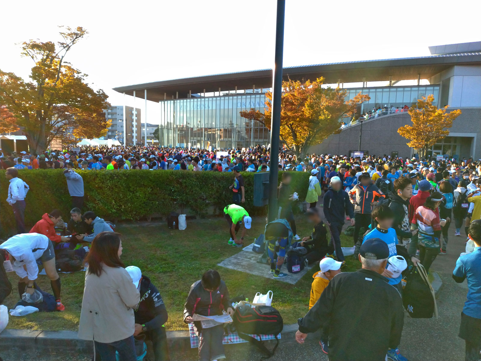 8時くらいに荷物預け、自分はZIPアリーナが荷物預け場だったので、1Fに降りて荷物を預ける。 それからもう一度トイレへ。 この時間のトイレは大混雑。 小用の列に並んだのだが、それでも10分くらいはかかったと思う。 各ブロックへの整列は8時半まで。 8時20分くらいに並ぶ、今回の自己申告タイムは3時間29分59秒で出したのかな、詳しいタイムは忘れてしまったがサブ3.5のタイムだったと思う。 それで割り振られたブロックはAブロック。 Sブロックが先頭なので、2番目のブロックだ。 AブロックはBブロックより人数が少ないらしく、締切10分前でもあまり混雑していなかった。