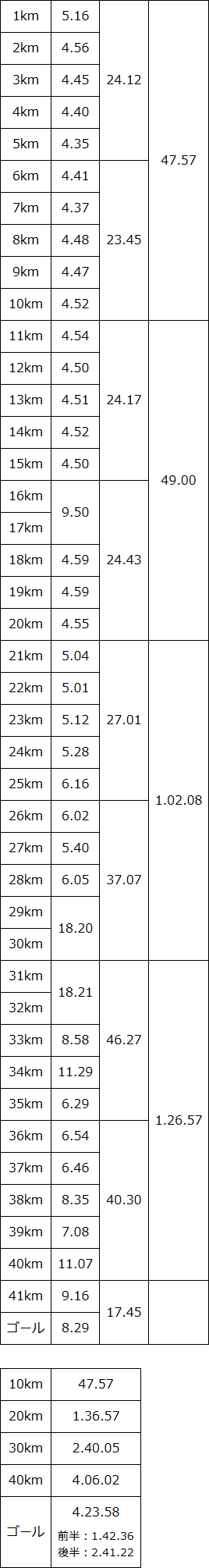 21.1km地点の中間地点でのタイムは、1時間42分36秒。 目標では1時間42分~43分台としていたので、ちょうどピッタリなタイムだった。