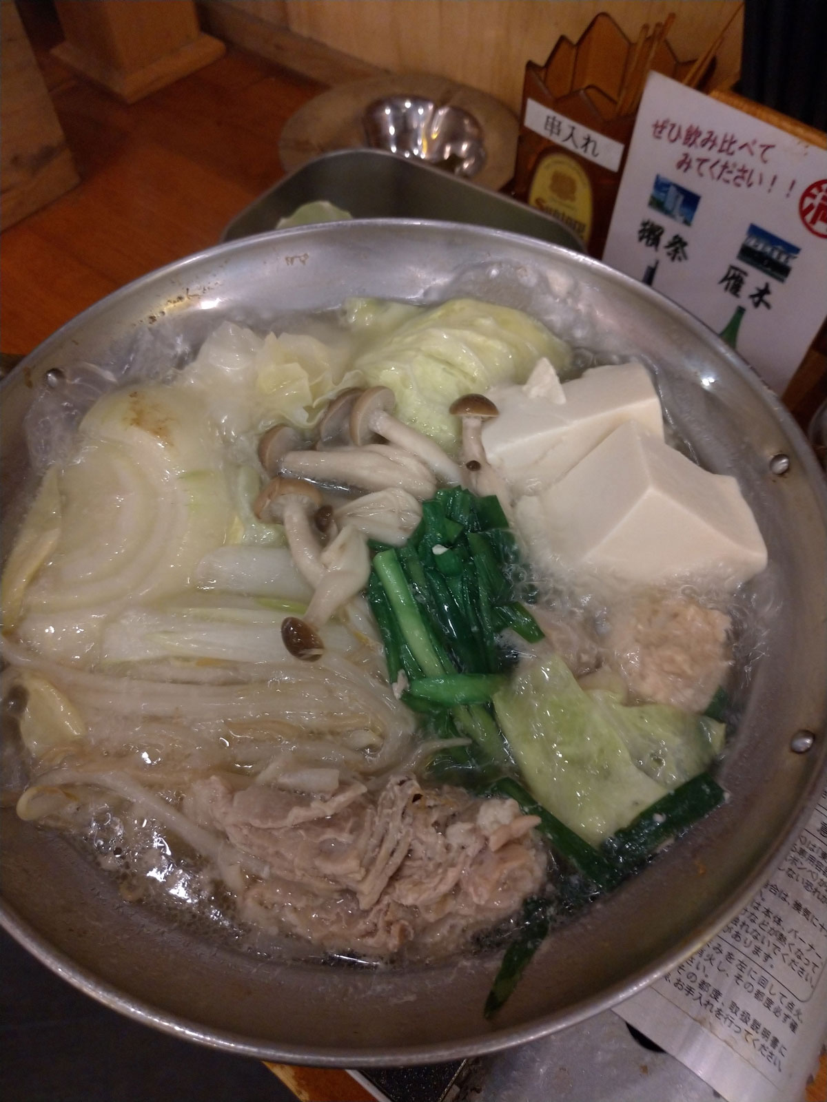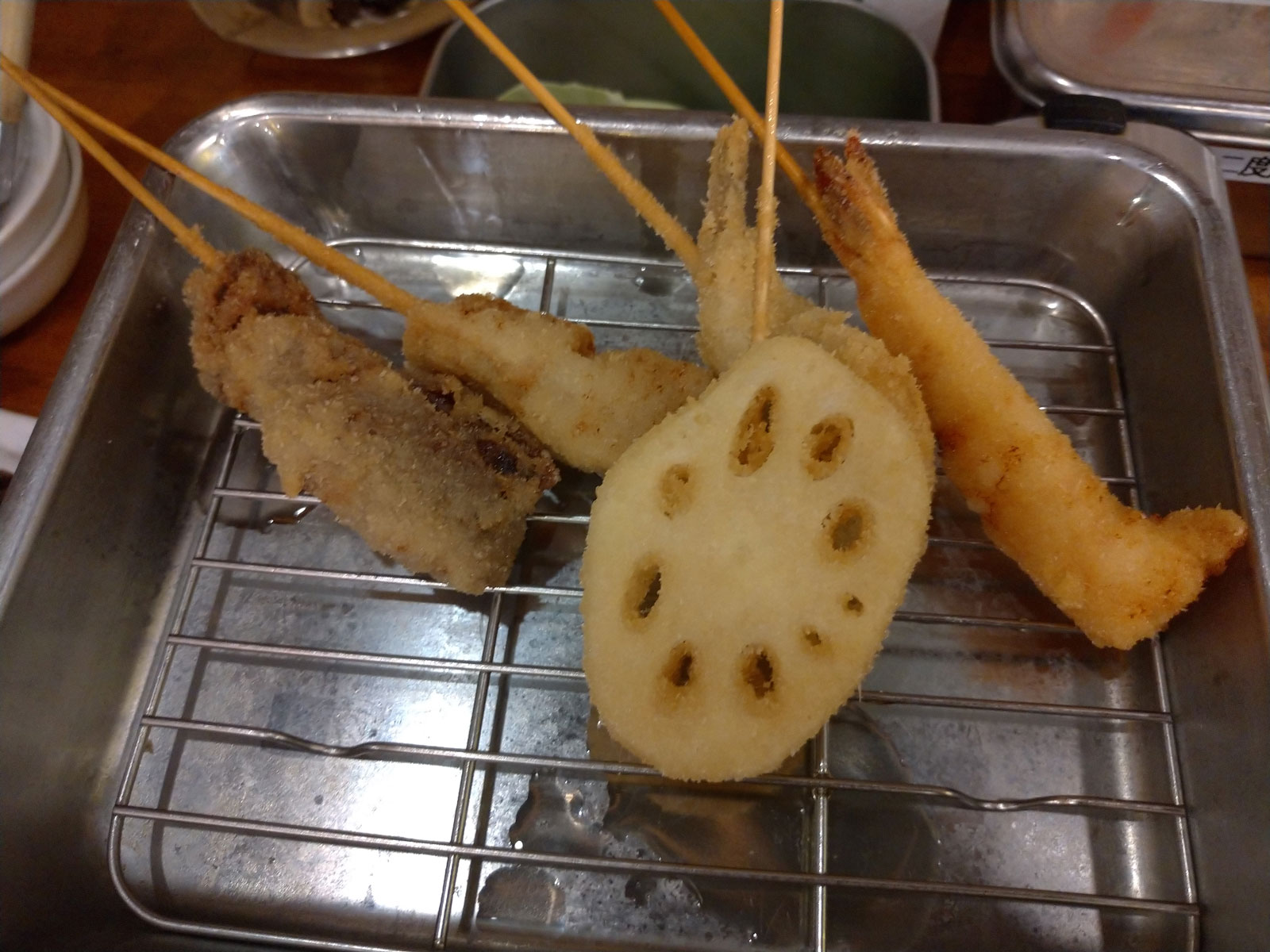 ホタルイカの沖漬け、シーザーサラダ、串カツ5種盛り、塩タン焼き、ブリの刺し身、塩寄せ鍋、それとビールを3杯。 食べきれるか微妙だったが、ギリギリ食べきれるくらいの量だった。