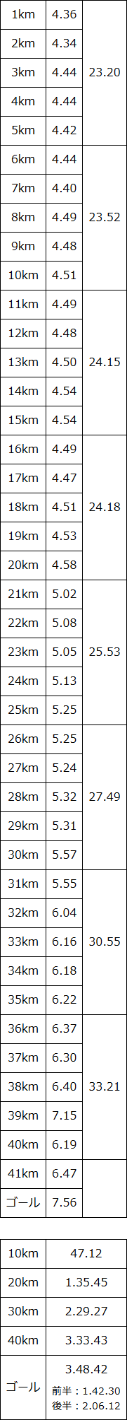 11km~20kmまでは、4.49, 4.48, 4.50, 4.54, 4.54, 4.49, 4.47, 4.51, 4.53, 4.58と、ずっと5分を切るペースで走っており、この10kmを48分33秒で走った。