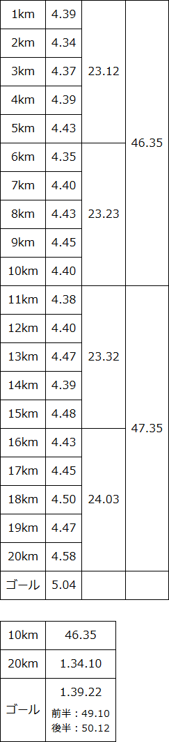 中間点の通過は49分10秒だった。 1時間40分のちょうど半分は50分00秒なので、目標を50秒上回っている。 が、たった50秒しか上回れていない。 これから後半戦、前半よりもキツイのは確実なので、どこまでペースダウンせずに行けるだろうか。 残り10kmで50秒しか落とせないので、キロ4分48秒ペースまでしか落とすことが出来ない。 まだまだ厳しい戦いは続く。