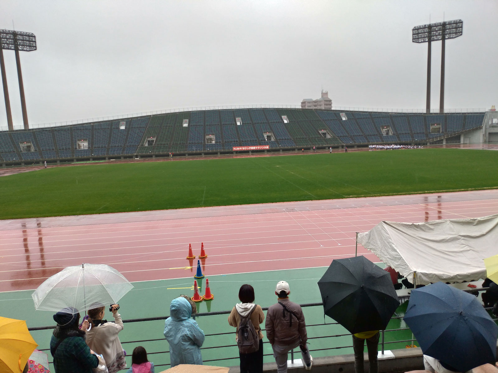 朝は7時に起床して、7時半くらいに家を出発。 ガソリンスタンドやコンビニに寄って、到着したのは8時20分くらい。 受付は9時からなので、この時間なら駐車場はまだ競技場の敷地内に止めることができて良かった。 野球場の方の駐車場になってしまったら雨の中遠くまで歩かないといけないので。