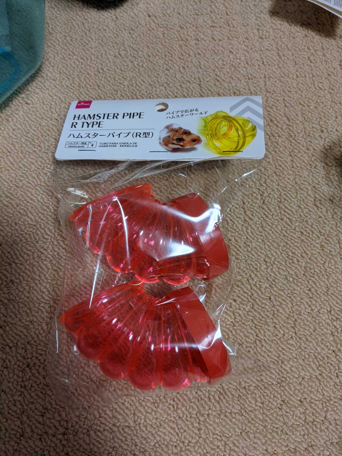 夜はダイソーに行ったのだけど、今までなかったハムスター用品コーナーが出来ていて、そこにハムスター用のパイプが売っていた。 西村ジョイで買うと300円くらいするのだが、ダイソーなら100円で買える。 何本か買ってきて試してみたけど、持っている製品と互換性はあったが、パイプとパイプをくっつける部分の強度が弱そうだった。 とりあえずハムスターの家とパイプを繋いでいろいろ試してみる。