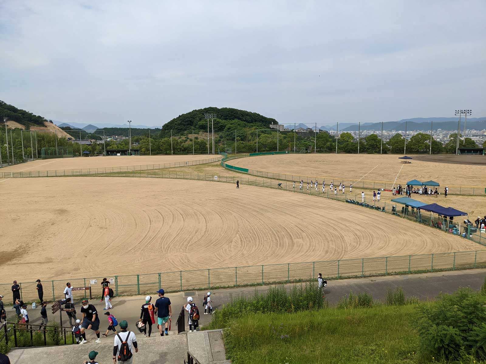 場所は東部運動公園で、9時から受付なので、8時過ぎに家を出発して、ハローズで朝ごはん・昼ごはんを購入して、朝ごはんを食べながら会場に向かう。 東部運動公園は何度か遊びに来たことがあるけど、いずれも遊具広場で遊んだので、野球場の方に行くのは初めて。